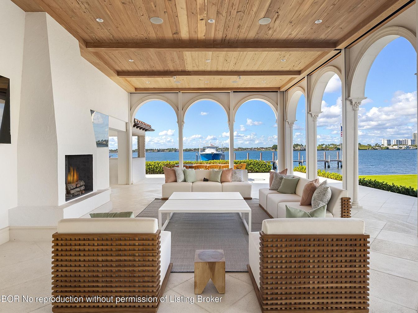 This stunning outdoor living space captures the essence of modern elegance. The expansive area features a combination of a cozy fireplace and large arched openings that invite natural light, enhancing the serene atmosphere. Earthy tones dominate the color scheme, with soft whites and warm wooden accents complementing the stone flooring. The sectional seating, adorned with colorful cushions, encourages relaxation and social gatherings, while the sleek coffee table provides a stylish focal point. The backdrop of picturesque waterfront views adds a tranquil vibe, making this space perfect for family gatherings or intimate evenings, seamlessly connecting indoor luxury with outdoor beauty.