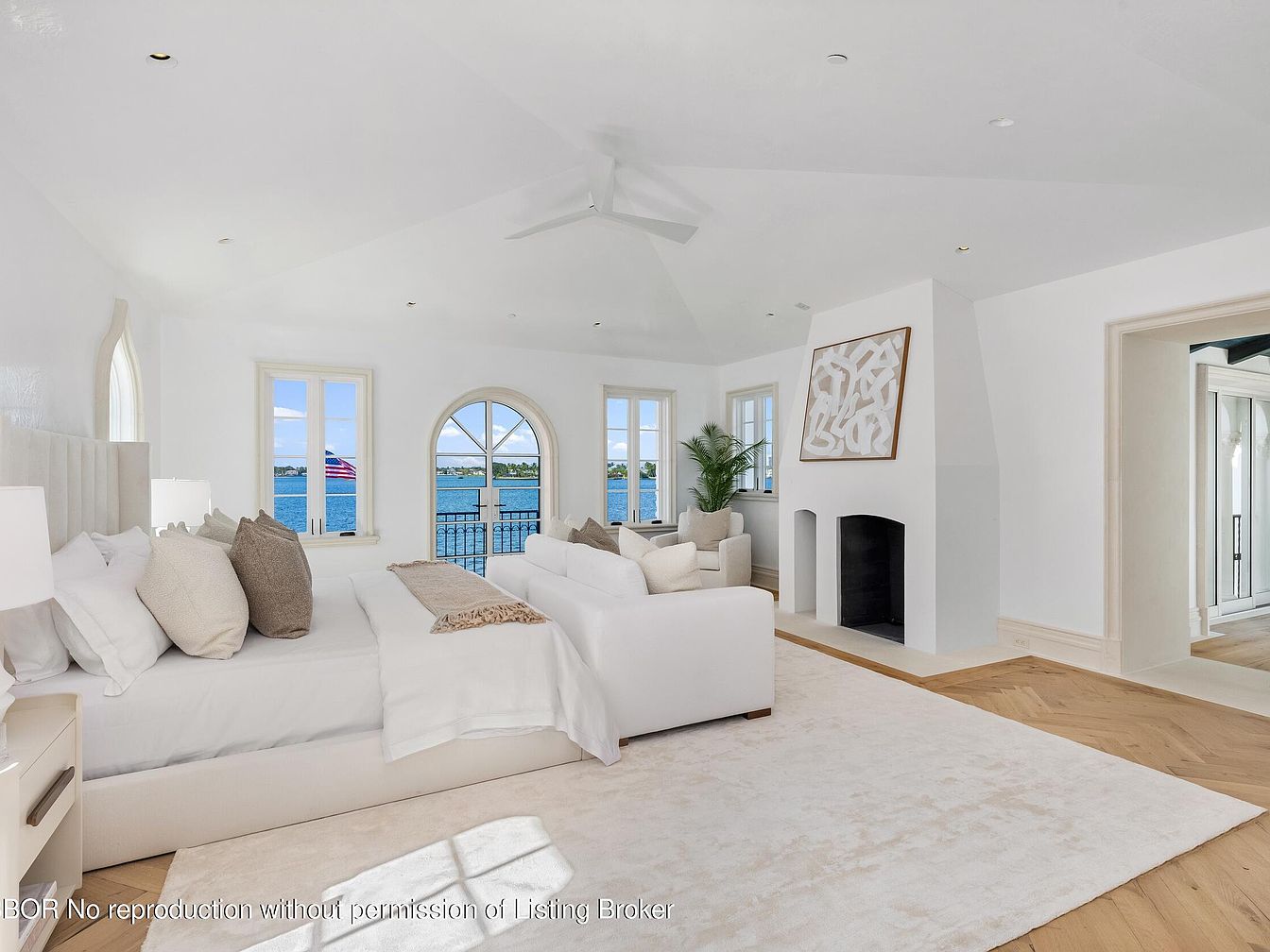 This master bedroom retreat emphasizes tranquility with its spacious layout and serene coastal views. The design features a soft color palette, primarily white, complemented by warm wood accents in the flooring and furnishings. A plush, textured rug anchors the seating area, while oversized windows bathe the room in natural light, providing stunning vistas of the waterfront. The elegant fireplace adds a touch of luxury, framed by modern artwork that enhances the aesthetic. Cozy bedding adorned with varying textures invites relaxation, while a plush sectional sofa perfect for lounging creates a welcoming atmosphere for family and guests.