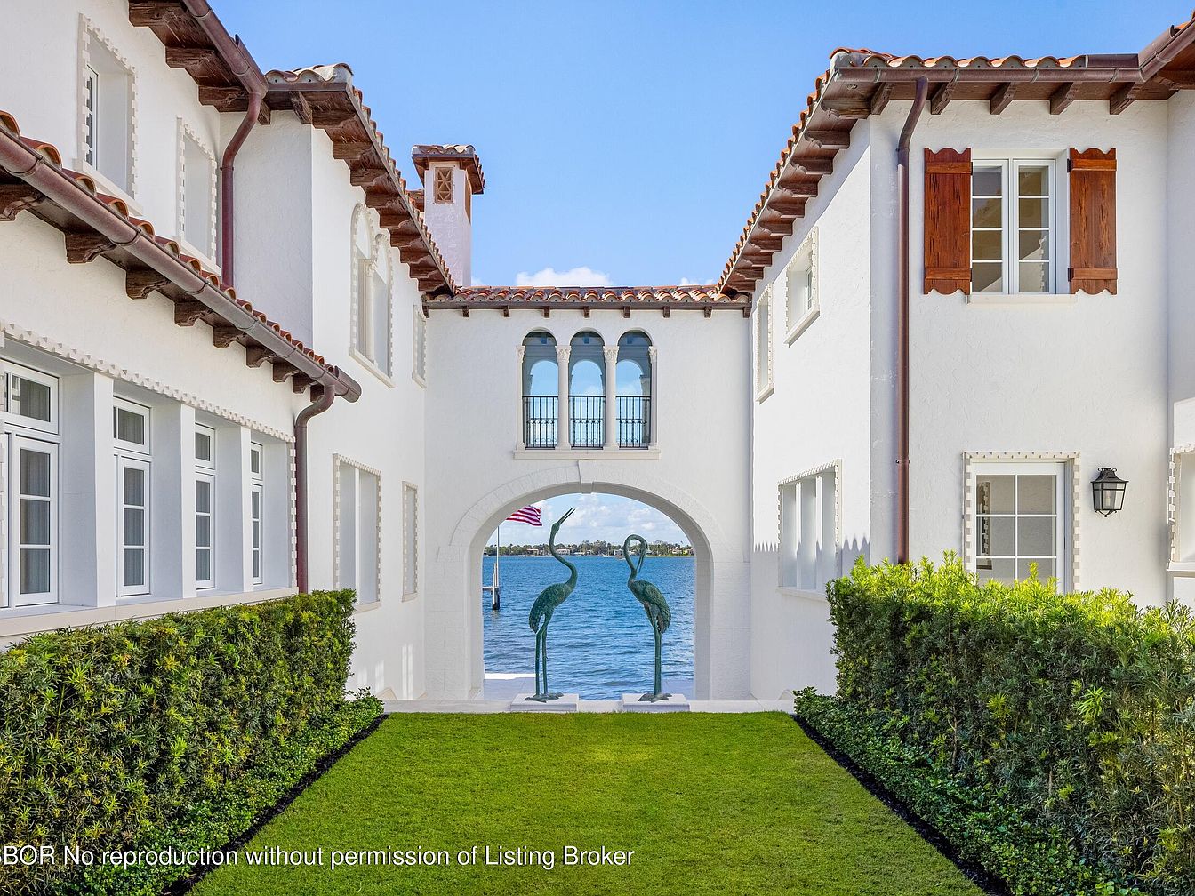This stunning courtyard serves as a serene transitional space, connecting the main house to the waterfront view. Whitewashed walls contrast beautifully with terracotta roof tiles and wooden shutters, enhancing Mediterranean charm. Lush greenery frames the pathway, providing a family-friendly atmosphere, while a striking pair of sculptures add artistic flair. The archway invites natural light, creating an airy ambiance that beckons relaxation. The expansive view of the water emphasizes a sense of tranquility, making this outdoor haven perfect for gatherings or peaceful mornings. Architectural details harmonize seamlessly with nature, encapsulating luxurious coastal living.