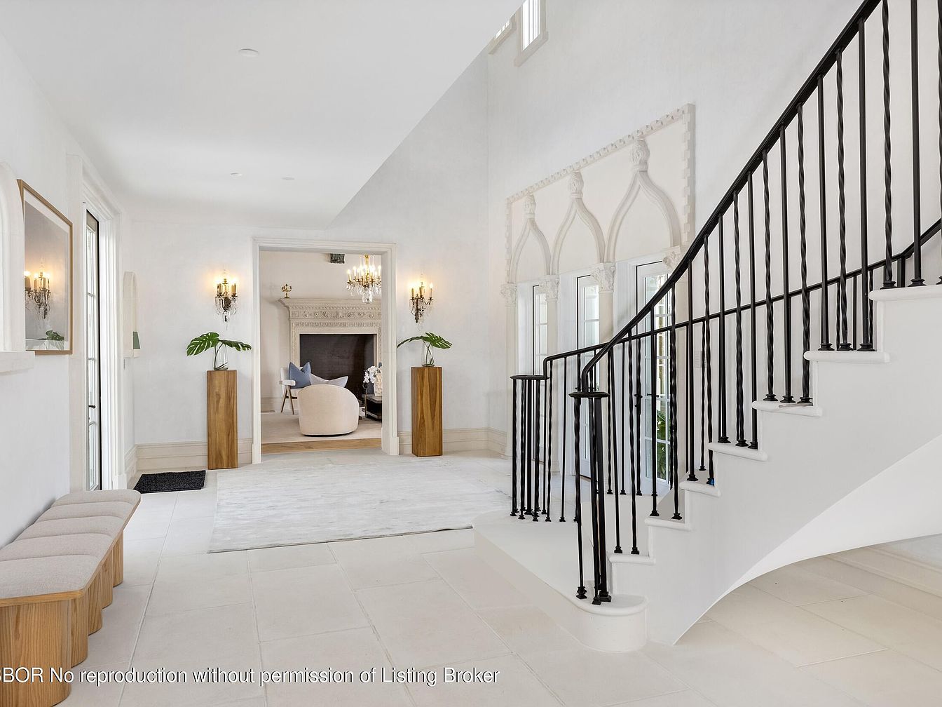 This stunning entryway combines sophistication and warmth, setting the tone for the entire home. The space features a grand, sweeping staircase with elegant black railings, leading to upper levels. Soft, natural light fills the area through large windows, highlighting the textured white walls and creating an airy feel. Beautiful wall sconces add a touch of charm, while the minimalist bench invites comfort. The polished stone flooring complements sleek wooden planters, each adorned with lush greenery. Architectural details, including arched doorways and subtle moldings, seamlessly integrate style and practicality, making this entryway both inviting and family-friendly.