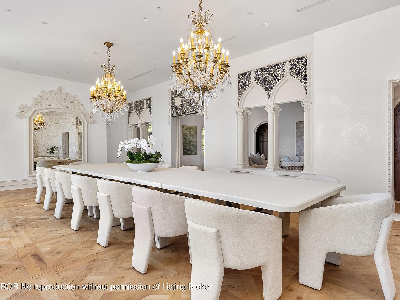 Featuring a stunning long dining table, this elegant space invites family gatherings and sophisticated dining experiences. The soft cream color palette harmonizes beautifully with the light wooden parquet flooring, creating a warm and welcoming atmosphere. Unique, plush chairs with contoured backs provide both comfort and style. Ornate chandeliers, adorned with crystals, add a touch of glamour, while the intricately designed wall arches bring a hint of architectural grandeur. A large, decorative mirror reflects natural light, enhancing the sense of openness. Delicate touches, like the centerpiece of fresh orchids, contribute to an inviting and refined ambiance, perfect for entertaining.