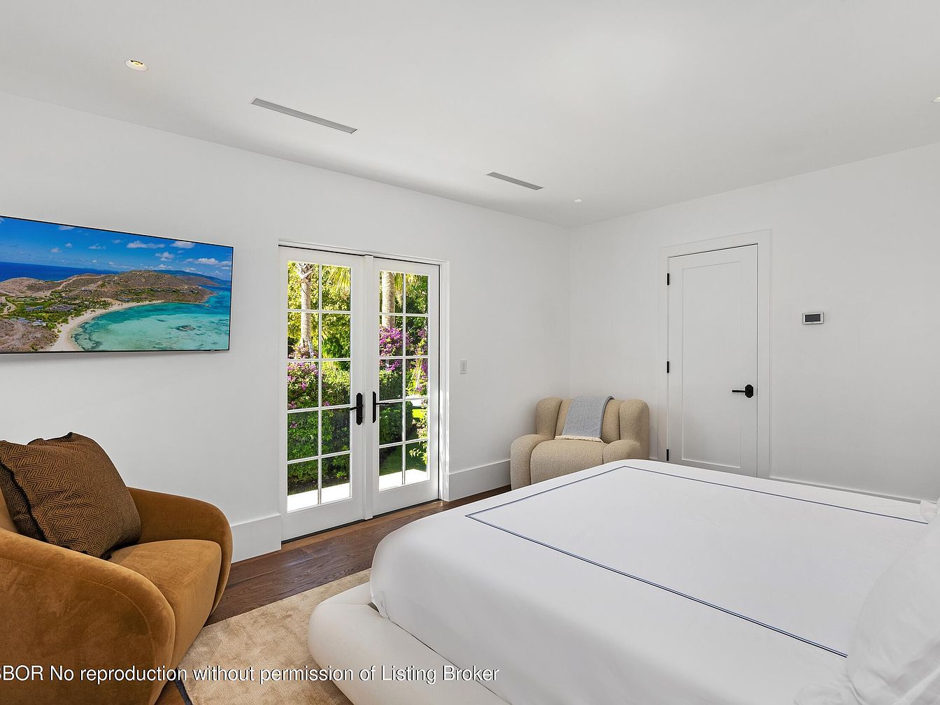 This serene master bedroom combines elegance and comfort, featuring a spacious layout with abundant natural light. The soft white walls enhance a calming atmosphere, accented by a rich wooden floor that adds warmth. A plush bed occupies the center, its crisp linens framed by a delicate blue trim. Beside it, a stylish armchair invites relaxation, ideal for reading by the French doors, which open to a vibrant outdoor garden. Large windows framed in black create a striking contrast, while a mounted television offers entertainment. This inviting sanctuary perfectly balances functionality and aesthetic, creating a perfect personal retreat.