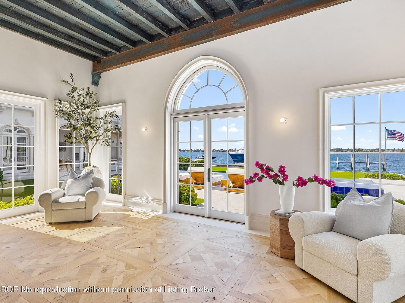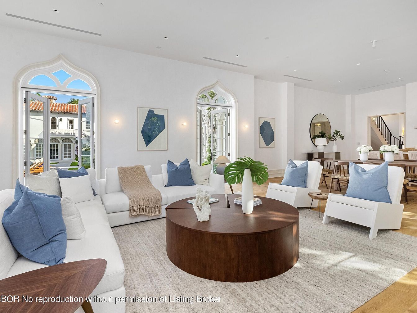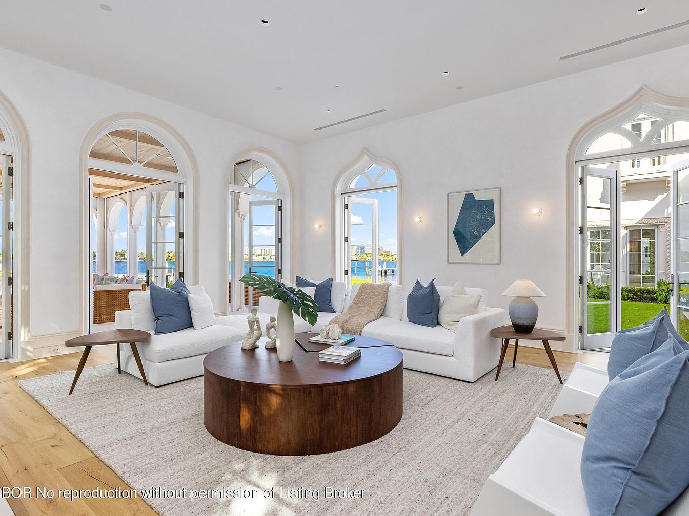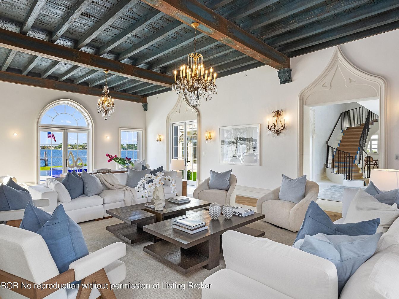 The spacious living area features a stunning blend of modern and classic design elements. The high, exposed beam ceiling in a rich blue hue contrasts beautifully with the white walls, creating an airy ambiance. Plush sofas adorned with soft, blue and gray pillows offer comfort, while a sleek wooden coffee table acts as a centerpiece. Light fixtures add elegance, with crystal chandeliers and sconces enhancing the room’s warmth. Large windows frame picturesque views of the water, flooding the space with natural light. The open layout promotes family-friendly gatherings, inviting relaxation and connection in this exquisite home.