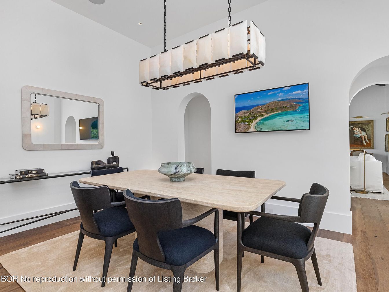 Featuring a modern dining room, this space maximizes comfort with a warm wooden table, surrounded by sleek, dark chairs that invite family gatherings. A striking light fixture hangs above, providing ambient illumination while maintaining an airy feel, enhanced by the high ceilings and soft white walls. Architectural arches add a touch of sophistication, leading to other areas of the home. A large mirror reflects light, enhancing the sense of openness, while a contemporary TV blends technology with style. Earthy tones and subtle textures create a serene atmosphere, perfect for both intimate dinners and lively celebrations.