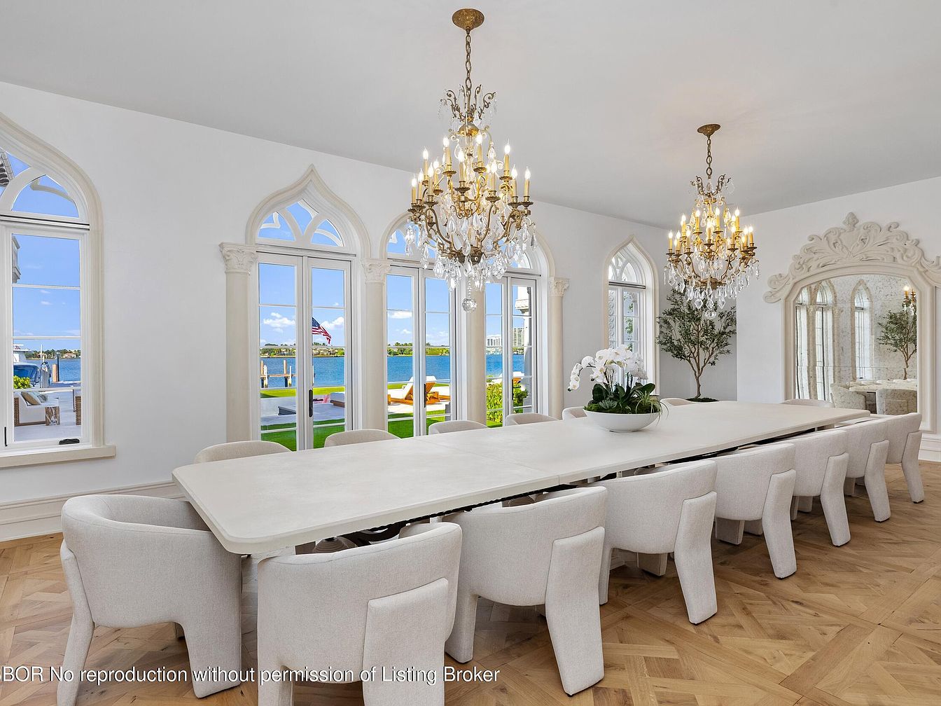 This elegant dining room showcases sweeping views of the lakeside beyond its stunning arched windows, flooding the space with natural light. The expansive rectangular dining table, surrounded by plush, neutral upholstered chairs, invites family gatherings, seamlessly combining comfort with style. Stunning chandeliers grace the ceiling, adding a touch of sophistication and warmth, while the intricate woodwork on the walls and mirrors reflect both classic and contemporary design aesthetics. The light color palette of soft whites and natural wood enhances the airy feel, complemented by decorative greenery, making it a perfect setting for memorable dining experiences.