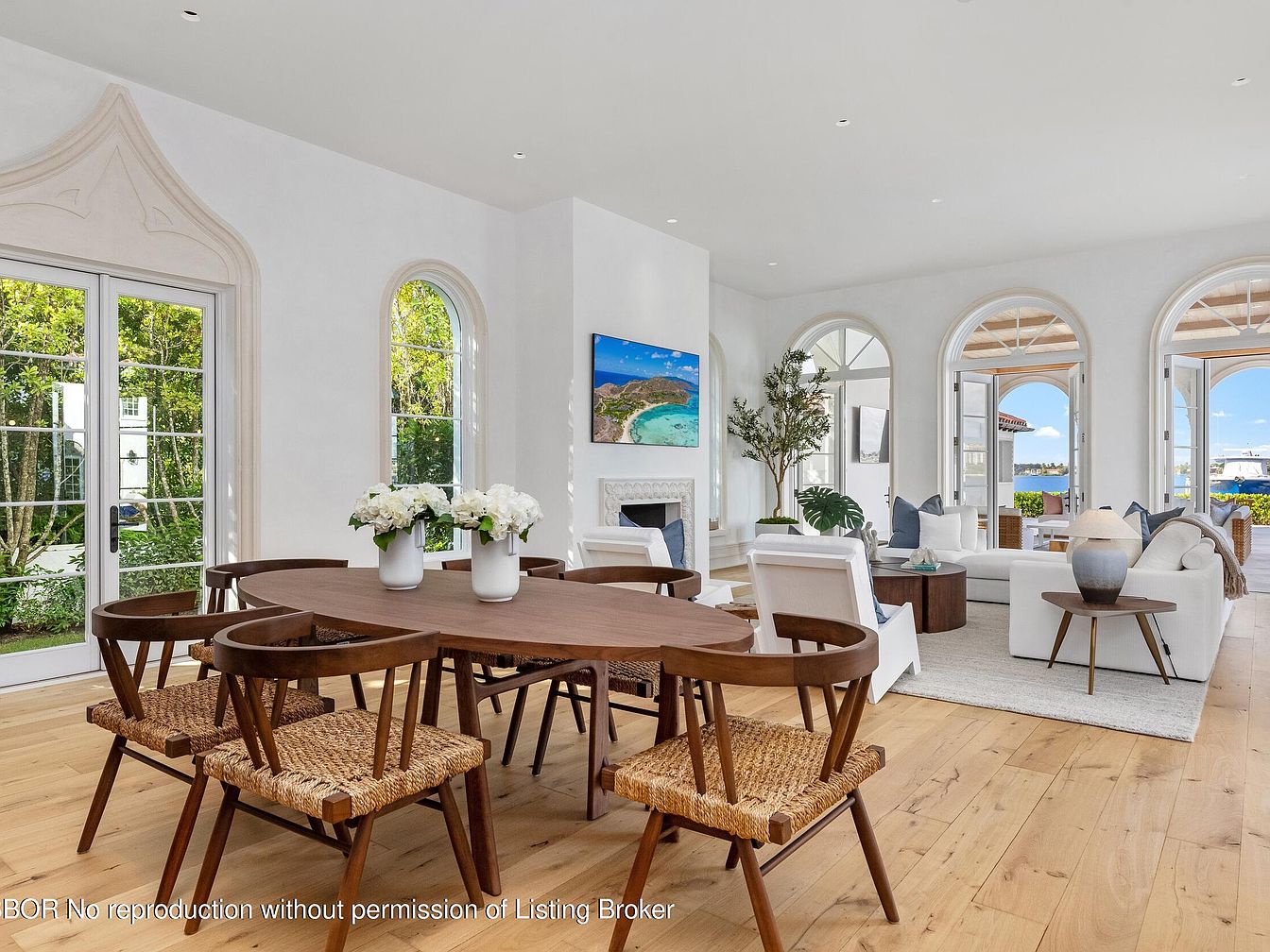 A harmonious blend of elegance and comfort defines this dining and living area. Sun-drenched through expansive windows, the open layout showcases a modern wooden dining table surrounded by stylish woven chairs. Light wooden flooring complements the soft color palette of creamy whites and gentle grays, while a cozy white sectional invites relaxation. Architectural arches enhance the room’s sophistication, drawing the eye towards intricate details and natural light. Potted greenery adds a touch of nature, creating a welcoming atmosphere. This space is perfect for family gatherings, fostering connection and warmth in an inviting, airy environment.