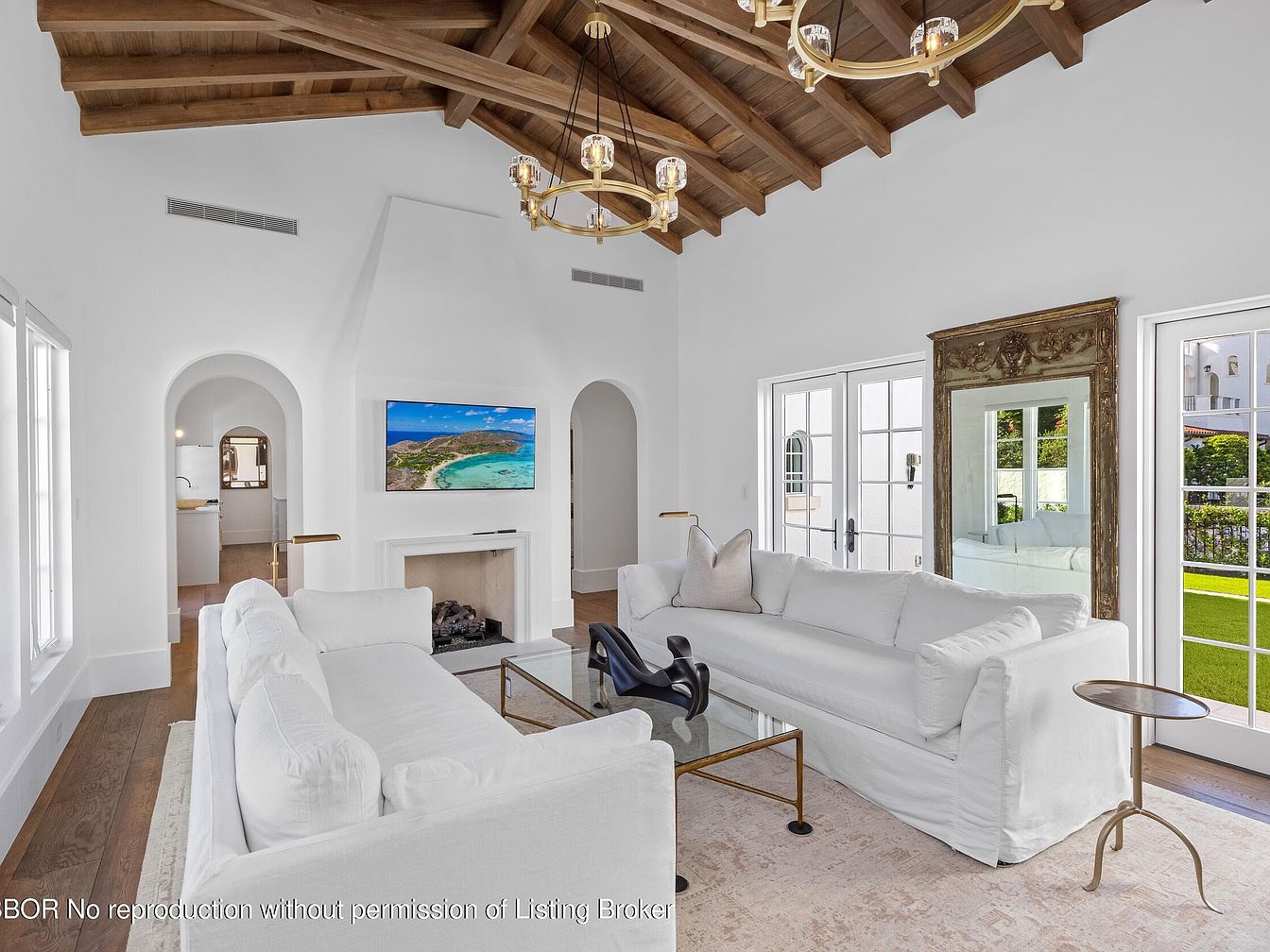 This spacious living room features a breathtaking vaulted ceiling, adorned with natural wood beams that enhance the airy feel. A soft, neutral color palette of whites and earth tones invites warmth and tranquility. Comfortably arranged, the plush white sectional sofa complements the glass coffee table, creating a perfect lounge area for family gatherings. Large windows flood the space with natural light, offering views of the lush outdoor greenery. Architectural details, including the elegant fireplace and an ornate mirror, add sophistication. The design seamlessly blends functionality and style, making it an inviting sanctuary for relaxation and connection.