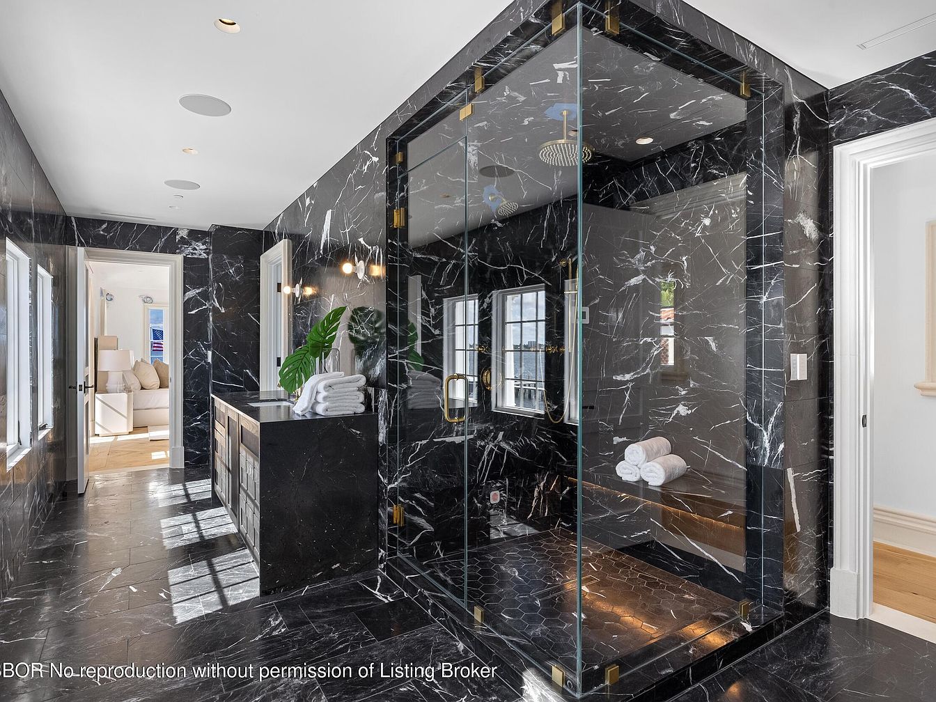 A stunning luxury bathroom showcases a sleek design with striking black marble walls and elegant gold accents. The spacious layout features a modern walk-in shower with frameless glass doors, highlighting intricate tile work beneath. A richly designed vanity offers ample storage, adorned with plush, folded towels and a lush green plant for a touch of nature. Soft, warm lighting illuminates the space, enhancing its sophisticated ambiance. Windows on one side invite natural light, contrasting beautifully with the bold dark hues. Ideal for a family, this serene sanctuary merges style with functionality, providing a tranquil escape in everyday life.