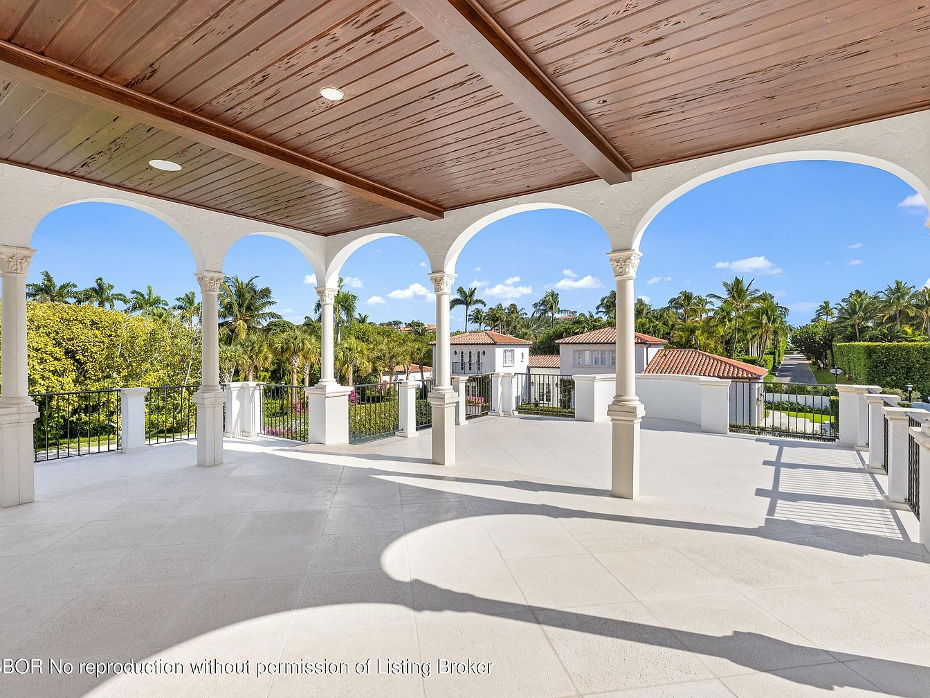 This stunning balcony showcases elegant architectural features, including grand columns and an intricately designed wooden ceiling that exudes warmth and sophistication. The spacious layout provides ample space for outdoor furniture, perfect for family gatherings or relaxed evenings. Adorned with white stone flooring, the area seamlessly blends indoor and outdoor living. Breathtaking views of lush greenery and palm trees surround the space, enhancing its tranquil ambiance. With a modern wrought iron railing, safety and style are prioritized, making this balcony not only aesthetically pleasing but also family-friendly. A perfect setting for enjoying the serene environment.