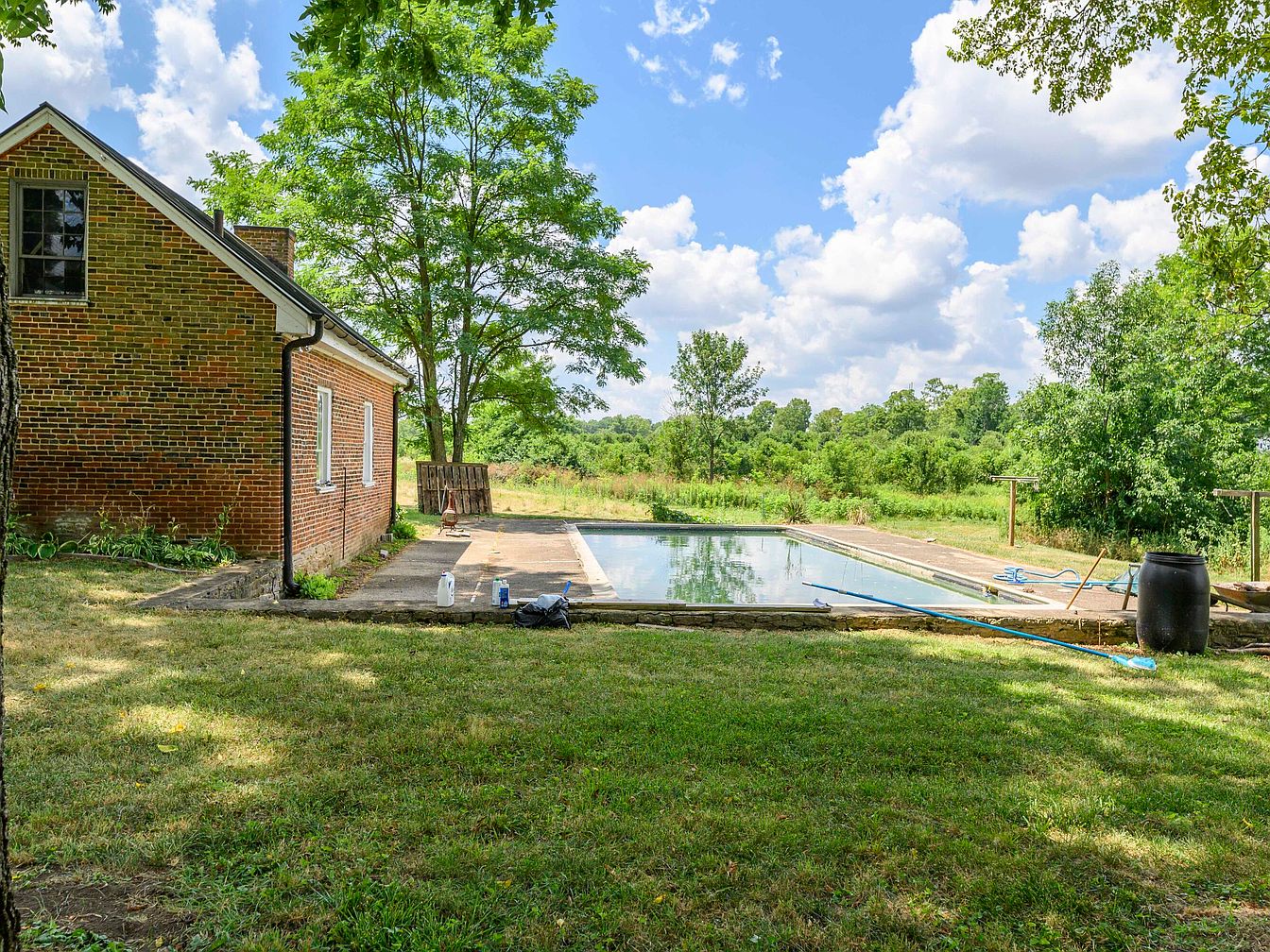 A charming backyard oasis combines the rustic appeal of a classic brick home with the refreshing allure of a private pool. Surrounded by lush greenery and open fields, the space invites relaxation and outdoor play for the whole family. The concrete patio around the pool offers plenty of room for lounge chairs or family gatherings, while mature trees provide welcome shade and a sense of privacy. The warm brickwork adds character and contrasts with the tranquil blue of the pool. This idyllic outdoor setting is perfect for both recreation and peaceful moments, making it a versatile feature for a family home.