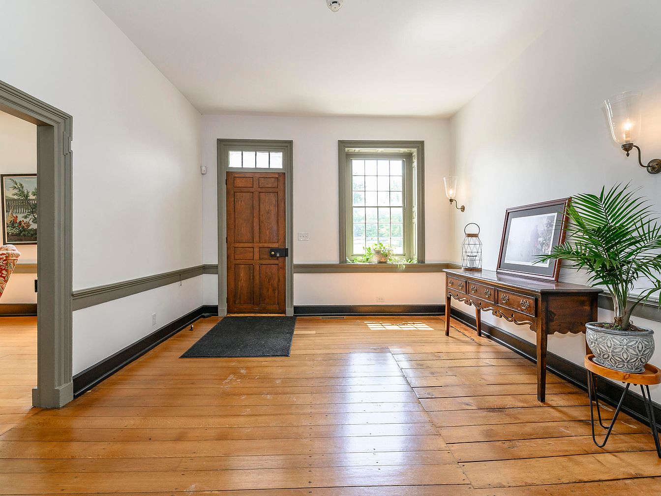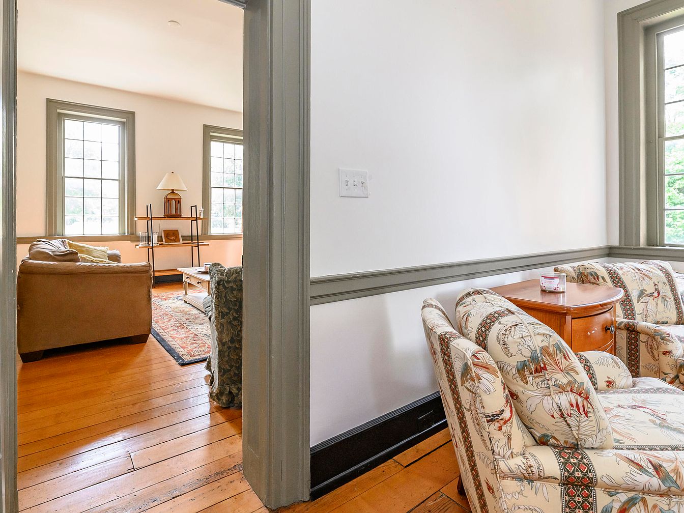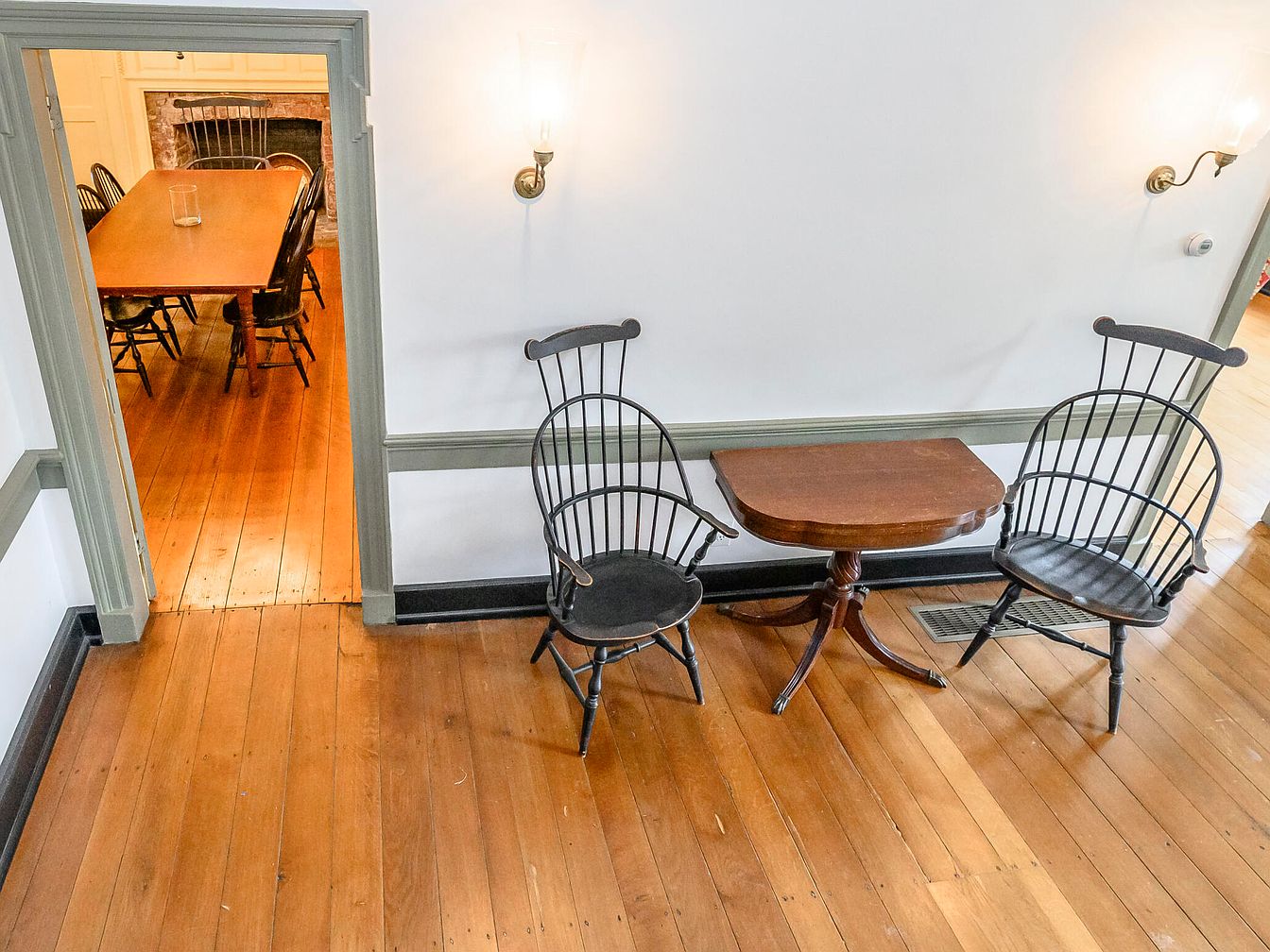A cozy and inviting hallway features two classic Windsor chairs paired with a warm wooden accent table, perfect for quiet moments or afternoon conversations. The space showcases beautiful honey-toned hardwood floors that flow seamlessly into an adjoining dining room, visible through a wide doorway. Muted green trim adds subtle contrast against the crisp white walls for a timeless look. Wall sconces provide soft, ambient lighting, enhancing the hallway’s charm. The layout encourages movement between areas, making it a family-friendly bridge between social spaces. Durable furnishings ensure longevity, creating a welcoming, practical transition area in the home.