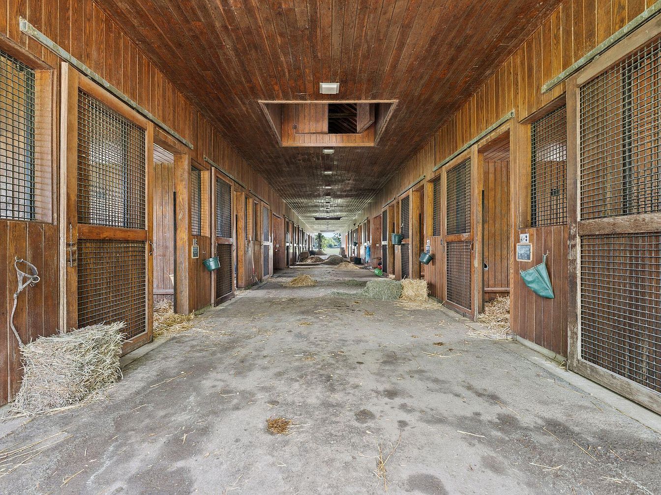 A long, central stable corridor crafted from warm-toned wood creates an inviting yet functional atmosphere for equestrian family living. Rows of roomy horse stalls line both sides, each featuring sturdy wood panels and secure mesh fronts for ventilation and visibility. Hay bales and feed buckets are thoughtfully placed, catering to easy daily routines. The generous overhead space and natural light at the end of the corridor enhance the welcoming ambiance. The layout is thoughtfully designed for safety, convenience, and supervision, making it an ideal space for families involved in horse care or seeking a rural lifestyle with close animal interaction.
