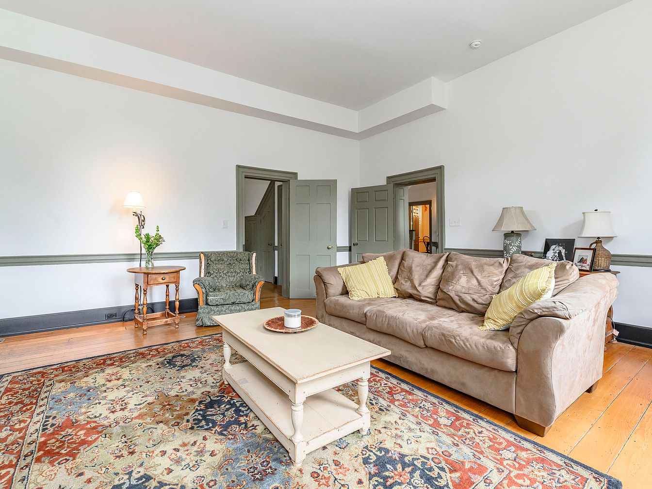This inviting living room combines classic charm with family-friendly comfort. Warm hardwood floors are complemented by a large, patterned area rug in rich reds and blues, adding color and texture to the space. A plush beige sectional sofa, accented with yellow throw pillows, offers ample seating for gatherings or relaxed evenings. The room features soft gray-green trim and doors that contrast elegantly with crisp white walls. Vintage-style end tables, traditional lamps, and an armchair with botanical upholstery provide both practicality and character, creating a cozy yet sophisticated setting great for hosting family activities or quiet moments alike.