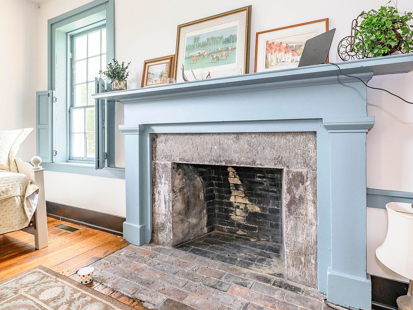 A charming fireplace serves as the heart of this cozy sitting area, featuring a wide mantel painted in calming powder blue that pairs with the matching window trim. Sunlight pours in through the tall gridded window, framed by shutters that add a touch of historic elegance. Above the mantel, family-friendly artwork, leafy greenery, and accents provide warmth and personality. The rustic brick hearth blends perfectly with the honey-toned wood floors and patterned area rug, creating a welcoming ambiance ideal for family gatherings. A comfortable upholstered chair to the side makes this corner perfect for reading or quiet relaxation.
