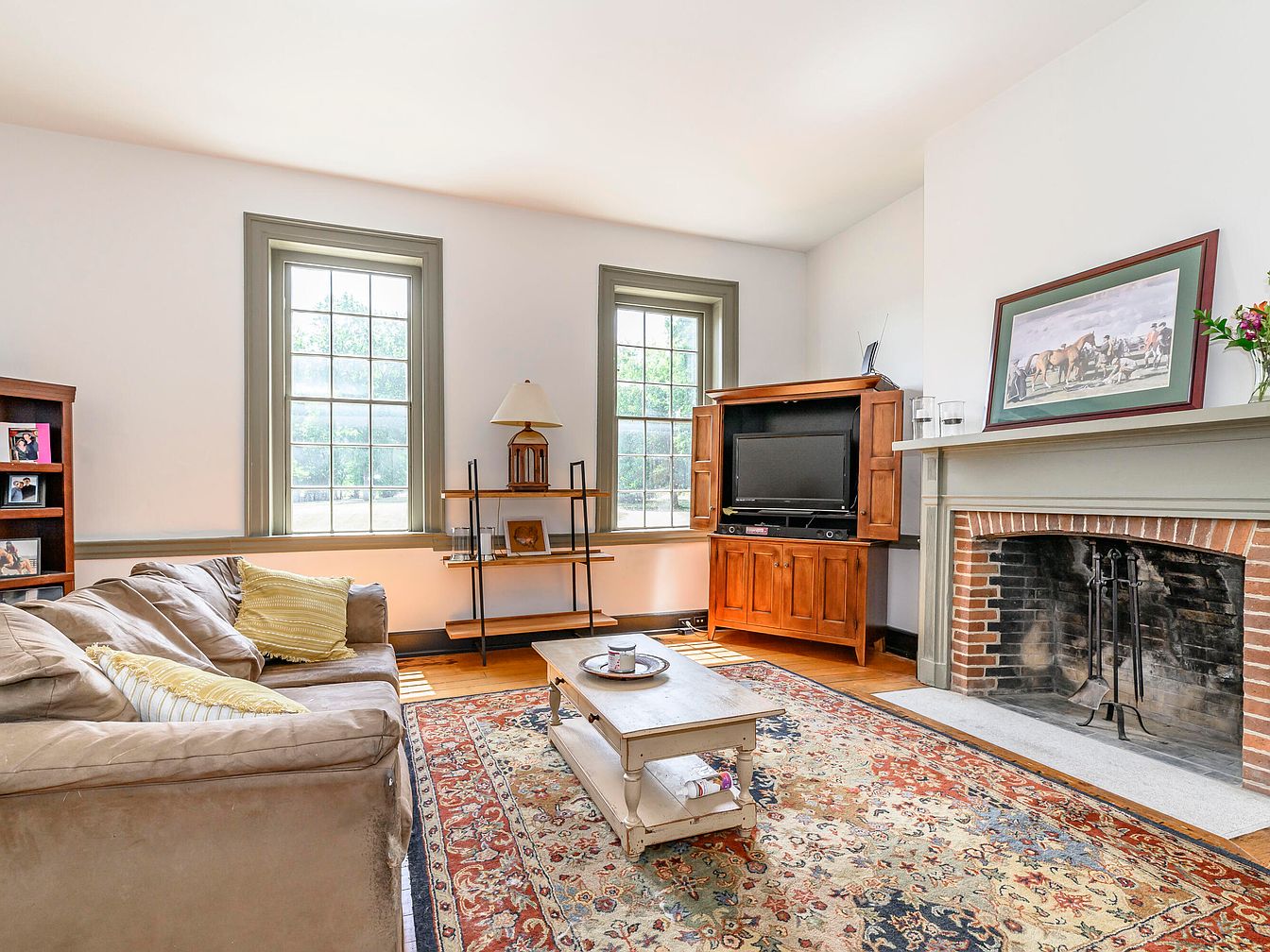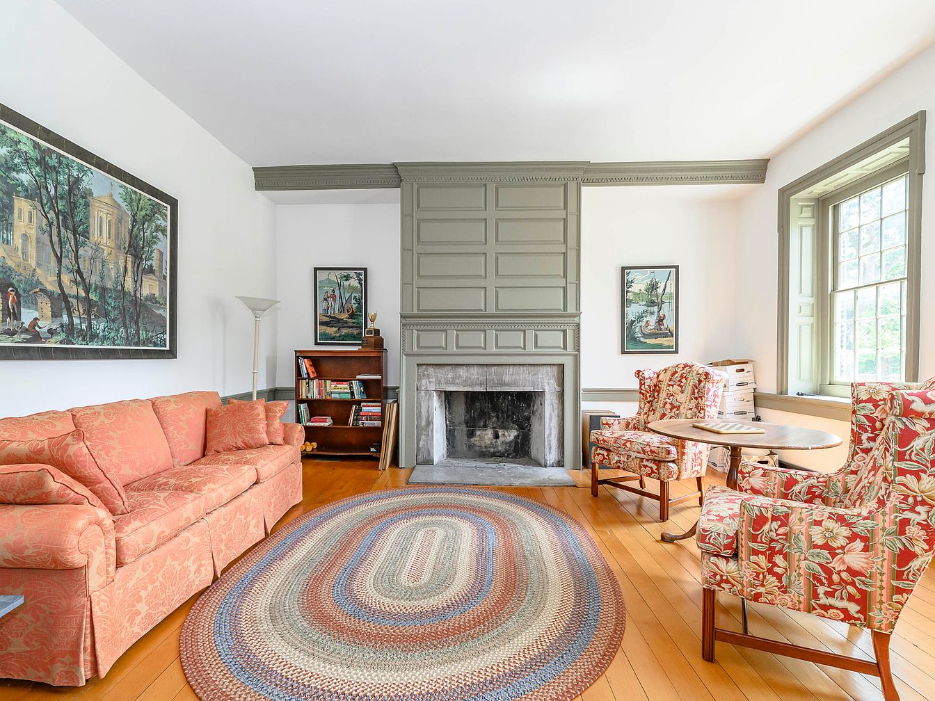 Warm sunlight spills through generous windows onto honey-toned hardwood floors, brightening this inviting living room. A stately fireplace with paneling painted a soft sage green provides a charming focal point, framed by graceful crown molding. An apricot-hued sofa and two cozy, floral upholstered armchairs create ample, comfortable seating ideal for families and guests. A braided oval rug adds texture and ties together the gentle earthy palette. Decorative touches like classic paintings and bookshelves infuse personality and warmth. The thoughtful arrangement ensures flow and accessibility, making the space both elegant and practical for gatherings or quiet afternoons.