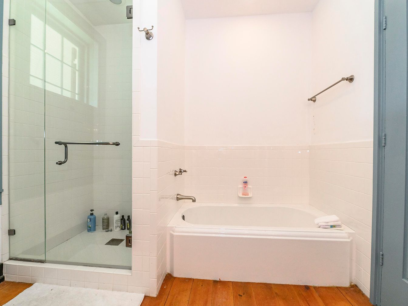 A modern, family-friendly bath and shower area features a spacious glass-enclosed shower next to a large soaking tub, perfect for busy mornings or relaxing evenings. The walls are tiled in pristine white, creating a clean and bright atmosphere, while the natural wood flooring adds warmth and character to the space. Stainless steel fixtures, including towel racks and shower handles, lend a contemporary touch. Essential bath products are neatly arranged, and simple folded towels provide convenient access. The layout ensures privacy and comfort, making it ideal for both adults and children to enjoy a soothing routine in a safe, inviting environment.