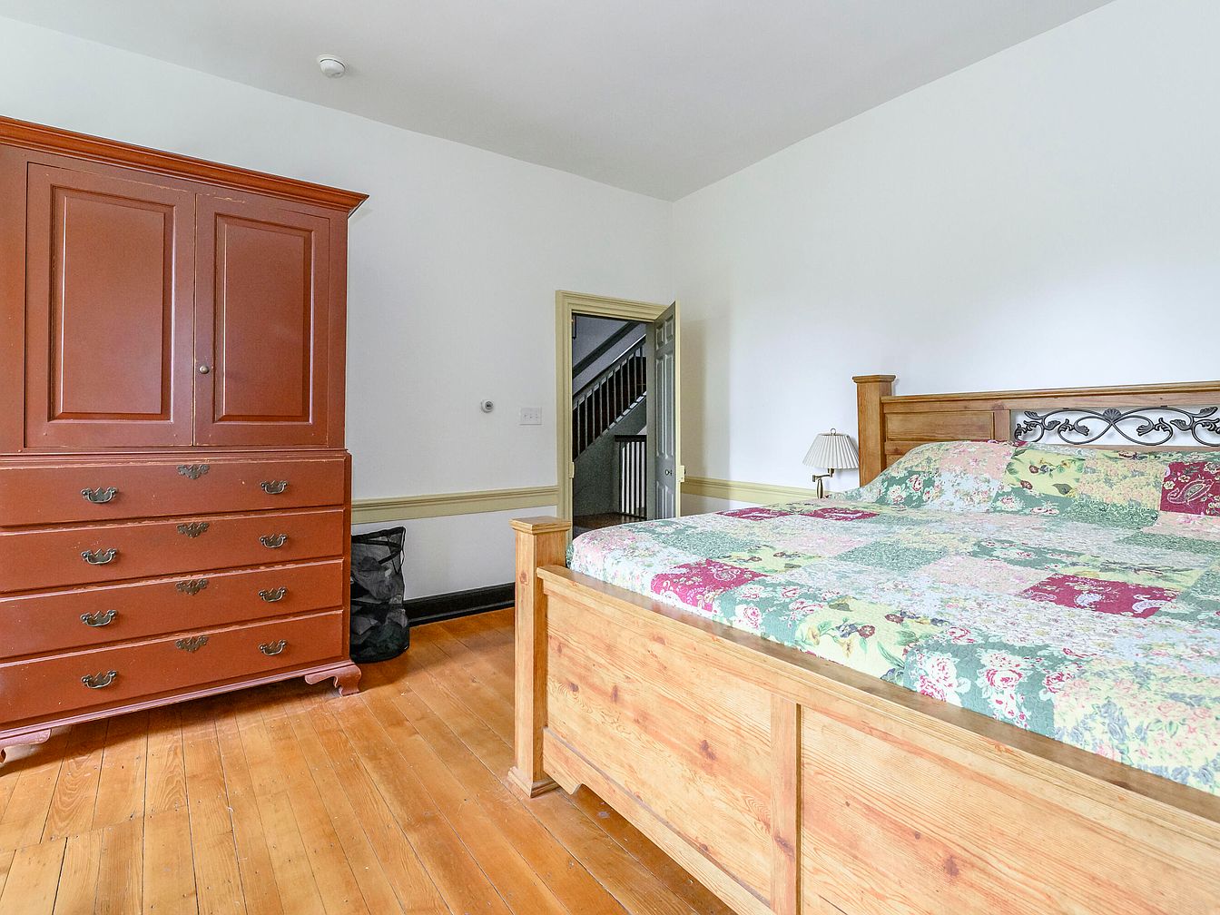 Warm hardwood flooring and a light, neutral color palette create a welcoming atmosphere in this spacious bedroom. A robust wooden bed frame is dressed in a charming patchwork quilt, adding a cozy and homey touch. A large, classic armoire and drawers in a muted brick red provide generous storage, ideal for family needs. The layout is open, with easy access to the hallway through a central doorway, and a bedside lamp offers practical night-time lighting. Subtle molding detail along the wall adds architectural character, making the space both functional and inviting for relaxation or quality family time.