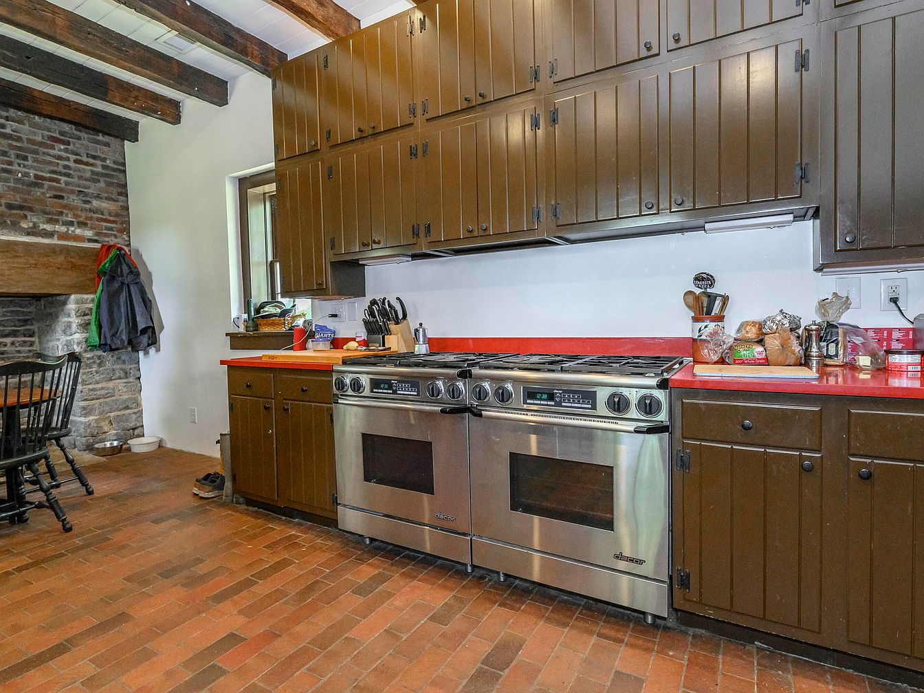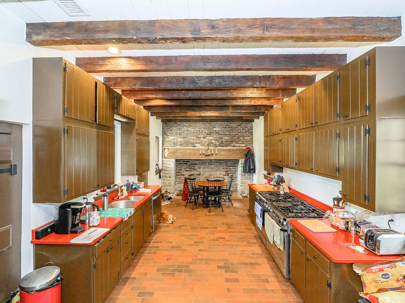 This spacious galley-style kitchen seamlessly blends rustic and modern elements, offering a warm and welcoming atmosphere for any family. Exposed wooden ceiling beams add character and charm, while the long stretch of rich brown cabinetry provides abundant storage for everyday essentials. Bright red countertops introduce a pop of color, creating a playful contrast against the muted cabinet tones. A large brick fireplace at the end of the room serves as a cozy focal point and offers additional seating with a small dining table. Durable brick flooring and practical appliances complete this inviting and family-friendly space, making meal prep and gatherings effortless.