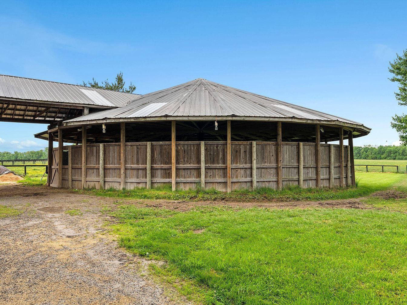 A spacious round wooden barn with a sturdy metal roof stands as a functional and rustic centerpiece amidst wide open green fields. The exterior features natural wood planks and open-air sections that blend practicality with a classic, country-inspired aesthetic. Perfect for family gatherings, animal care, or storage, the covered area provides shelter from the elements while maintaining excellent ventilation. The barn is set on a well-kept grassy lawn, with the surrounding landscape offering serene views and ample space for outdoor activities, gatherings, and exploration, emphasizing both utility and a welcoming, family-friendly environment.
