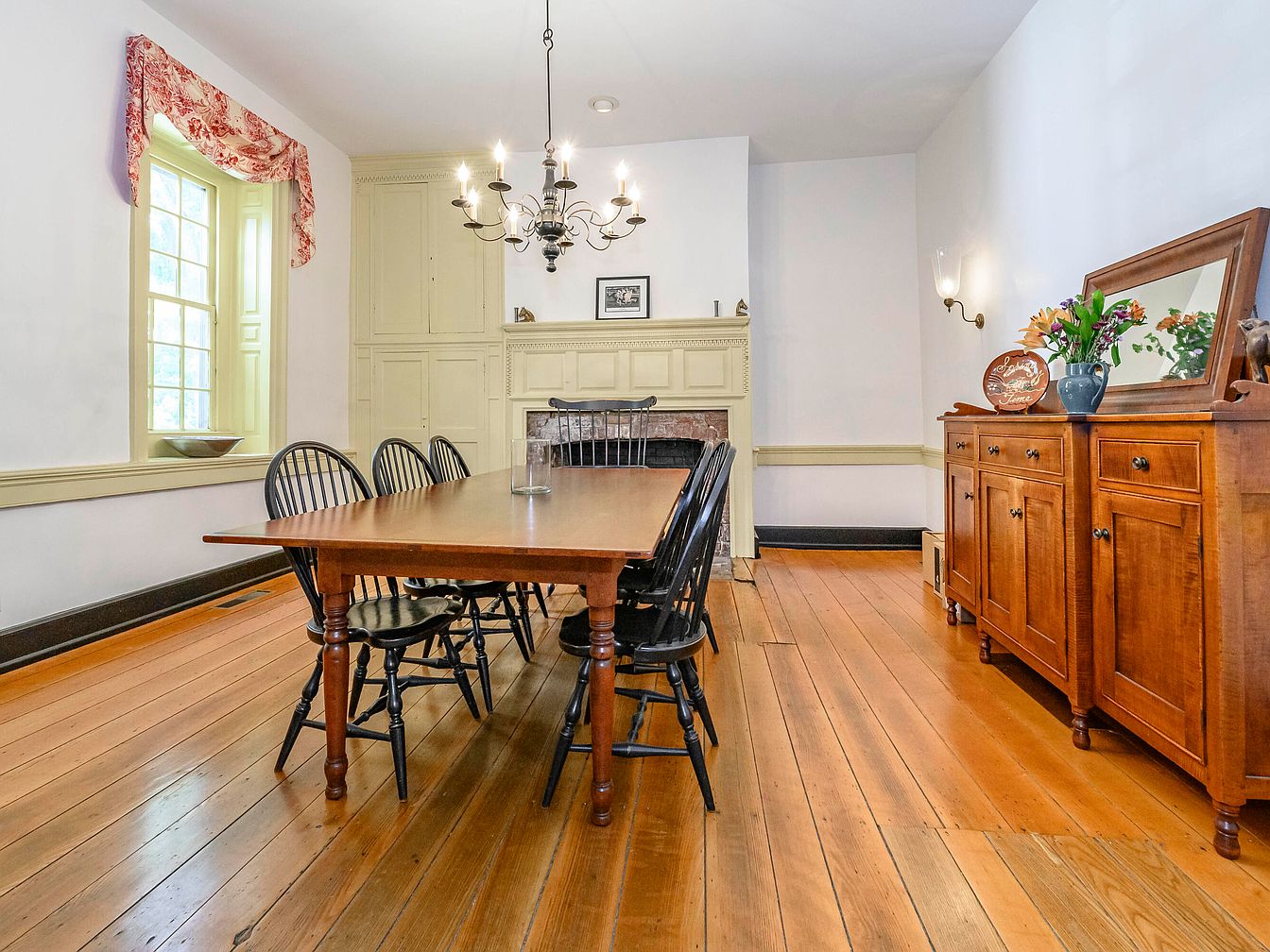 This inviting dining room combines classic charm with family-friendly practicality. At the center is a sturdy wooden dining table paired with six black Windsor chairs, perfect for hosting lively family meals or quiet gatherings. Natural light pours in from a large window dressed with a red patterned valance, creating a warm, cheerful atmosphere. The wooden plank floors, creamy trim, and a decorative fireplace with built-in cabinetry add character and function. A wooden sideboard offers ample storage and display space, topped with fresh flowers and a mirror. The overall palette blends soft neutrals with rich wood tones for a welcoming, timeless appeal.