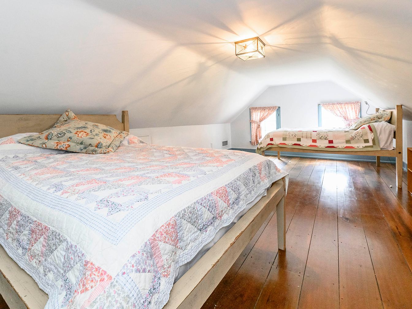 This inviting attic bedroom features slanted ceilings and warm wooden flooring, creating a snug and peaceful retreat ideal for siblings or guests. The two beds are adorned with patchwork quilts and vintage-style pillows, adding a charming, nostalgic touch to the space. Soft natural light filters through two small windows with delicate patterned curtains, creating a bright yet calming atmosphere. The simple, rustic furnishings maximize space and allow easy movement, while the open layout makes it perfect for children to share or for sleepovers. The subtle pastel color scheme and homey decor foster a comfortable, family-friendly environment.
