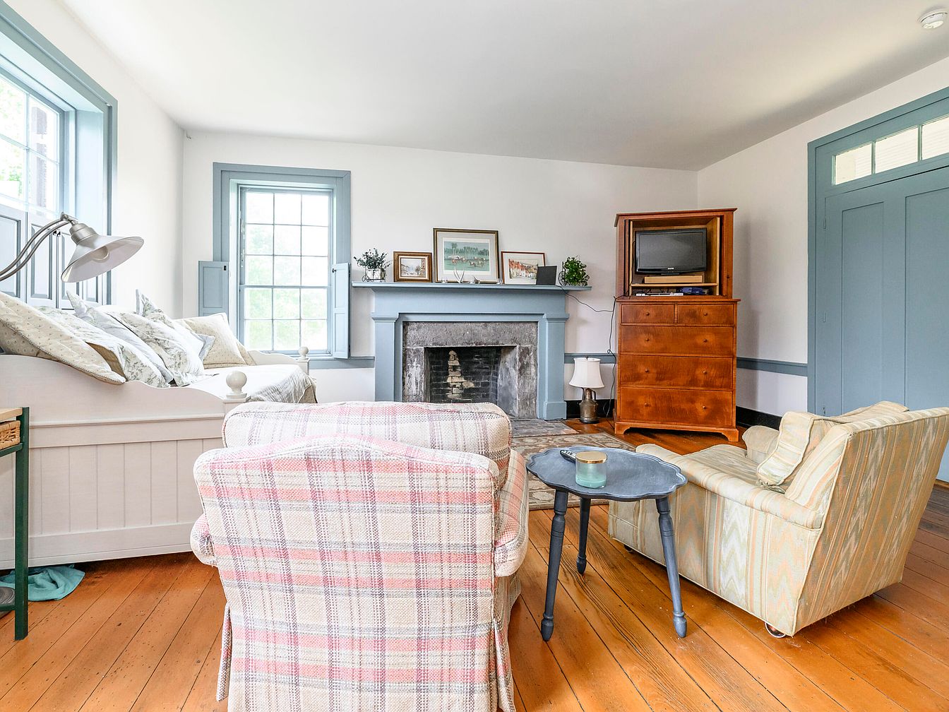 This inviting living room balances comfort and charm with a thoughtful layout ideal for families. Soft blue accents on windows, fireplace, and door trim add gentle color to the otherwise warm white walls. A bright bay window daybed provides a perfect reading or lounging nook, while a pair of plush armchairs in subtle plaid and pastel stripes create a friendly conversation area near the fireplace. Vintage-inspired wooden furniture, including a chest of drawers serving as a TV stand, adds a sense of tradition. The natural wood floors and carefully selected decor ensure a welcoming and relaxed ambiance for gatherings and everyday life.