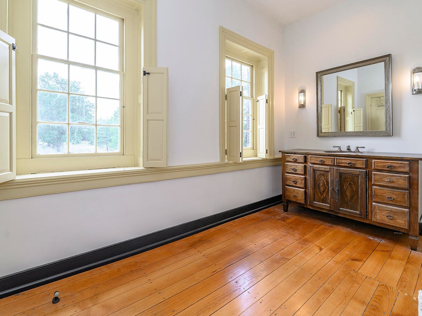 A bright and spacious bathroom nook is showcased with large paned windows inviting natural light into the space. The traditional wooden vanity features intricate detailing and offers ample storage with multiple drawers, making it ideal for family use. Neutral cream window frames and trim complement the soft white walls, lending a calm and inviting air. The hardwood floors add warmth and character while being practical for daily living. Above the vanity, a sizable mirror sits between two elegant wall sconces, providing both functional lighting and a classic aesthetic. The overall layout supports easy movement, perfect for busy mornings.
