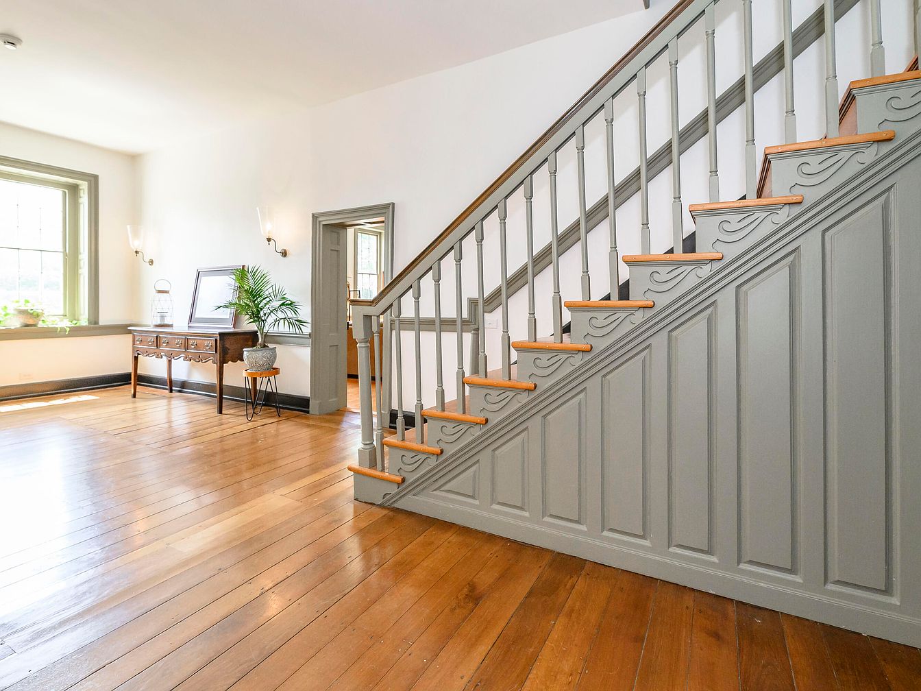 A spacious entryway highlighted by a beautifully crafted staircase with sage-green paneling and natural wood treads, creating a warm and welcoming atmosphere. The hardwood floors add a touch of classic Americana while offering easy maintenance for busy families. Large windows framed in matching green let in an abundance of natural light, making the space bright and cheerful. Decorative wall sconces and an elegant wooden console table topped with fresh greenery provide a sophisticated yet approachable accent. This open, uncluttered layout ensures safety and easy movement for children and guests, blending traditional charm with family-friendly practicality.