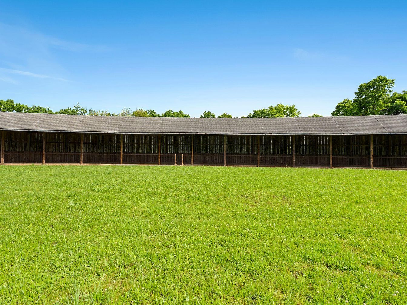 An expansive, lush green backyard stretches out under a clear blue sky, bordered by a long, semi-enclosed wooden shed. The deep brown wood creates a natural contrast against the vibrant grass, providing a rustic aesthetic that blends well with the surrounding trees and open landscape. The open-air structure is ideal for storage or recreational space, offering protection from the elements while maintaining visibility and fresh airflow. This setup is perfect for families who value outdoor activities, playtime, or gatherings, with ample space for children and pets to run freely and a versatile, shaded area for events or hobbies.