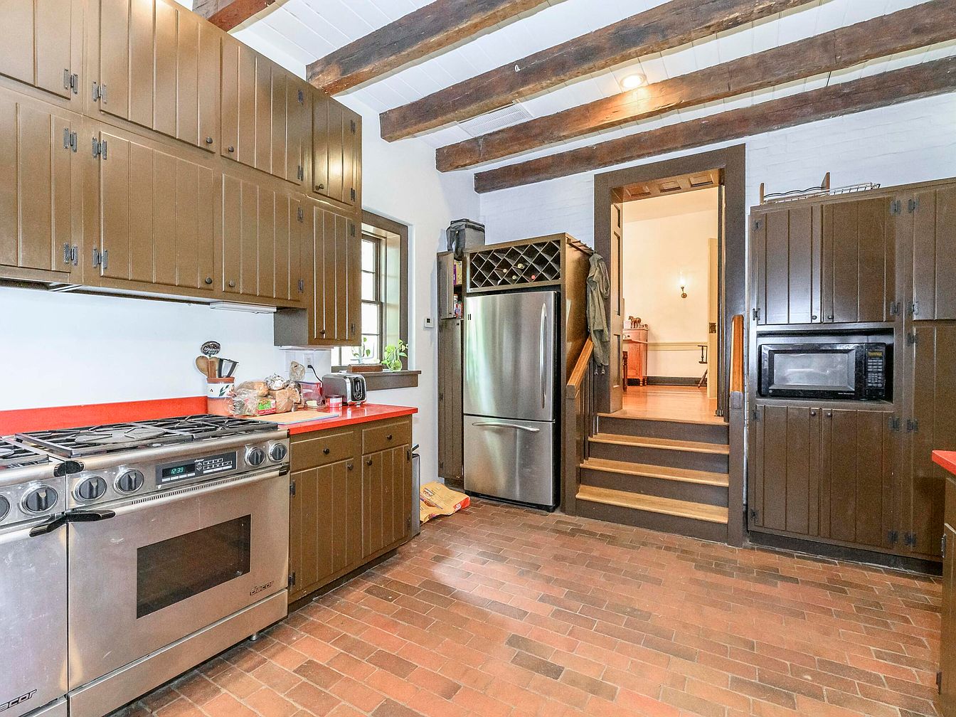 Rustic exposed wood beams highlight the ceiling, while brick flooring adds warmth and charm to this family-friendly kitchen. Ample storage is provided by deep, shaker-style brown cabinets that run along both the upper and lower walls, perfectly complemented by bold red countertops for a lively touch. Stainless steel appliances, including a spacious oven and refrigerator, add a modern flair. A built-in microwave and wine rack increase functionality. Natural light streams through a window above the sink, creating an inviting space ideal for family gatherings or everyday cooking. A step-up doorway subtly divides the kitchen from the adjacent living area, enhancing flow and accessibility.