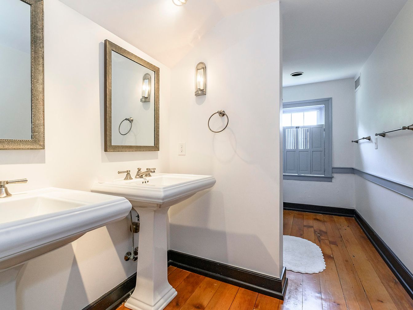 This spacious bathroom features a double pedestal sink setup, perfect for families or shared use. Simple yet elegant framed mirrors and brass fixtures offer a touch of sophistication, while wall-mounted lighting provides effective illumination for daily routines. The white walls and sinks create a clean, fresh atmosphere, complemented by natural light streaming in through a shuttered window with soft blue-grey trim. Warm, wide-plank hardwood floors introduce rustic charm and family-friendly functionality. Ample towel bars and a plush round bath rug enhance comfort and convenience, making this bathroom a practical yet inviting space for all household members.