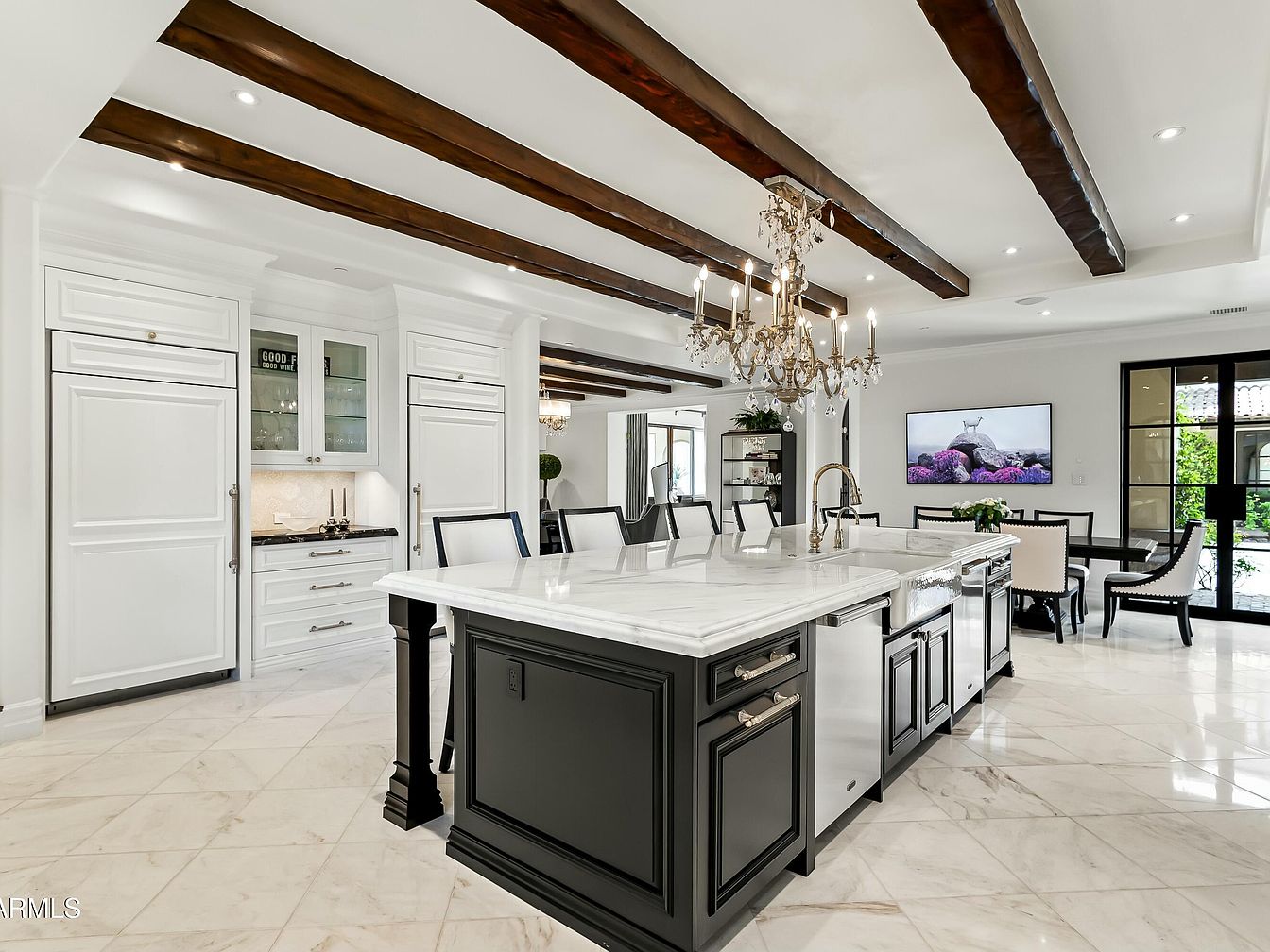 This stunning modern kitchen features an inviting open layout, perfect for family gatherings. The centerpiece is an elegant island with a sleek marble countertop paired with rich black cabinetry, combining sophistication and function. Natural light floods the space through large windows, highlighting the beautiful contrast of white cabinetry and dark wood beams overhead. High-end appliances integrate seamlessly, offering convenience for a busy household. A tasteful chandelier adds a touch of glamour, while the polished marble flooring enhances the area’s appeal. Cozy dining seats encourage family meals, creating a warm and welcoming atmosphere for all.