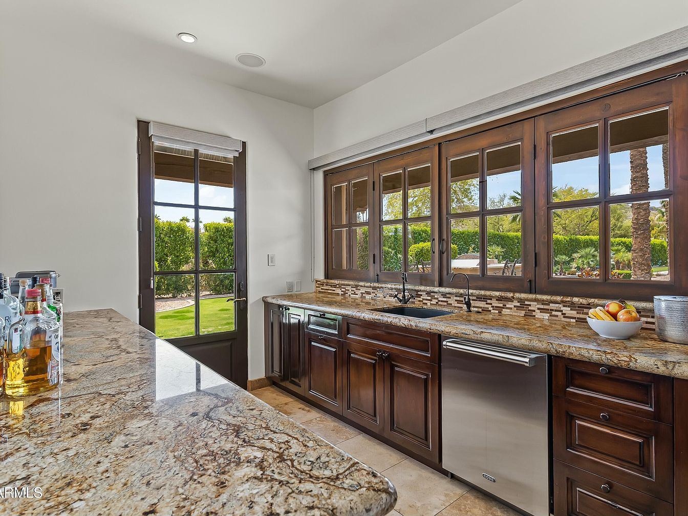 This modern kitchen seamlessly blends functionality and style, featuring a spacious layout with rich wooden cabinetry and a stunning granite countertop. Large, dark-framed windows provide ample natural light and an inviting view of the landscaped garden. The palette of warm browns and neutral tones creates an inviting atmosphere. A sleek stainless steel dishwasher and a stylish black faucet accentuate the contemporary vibe. Family-friendly design elements include a wide cooking area and easy access to outdoor space through the elegant double doors, perfect for entertaining guests or enjoying family meals al fresco. Simple yet sophisticated decor adds a personal touch.