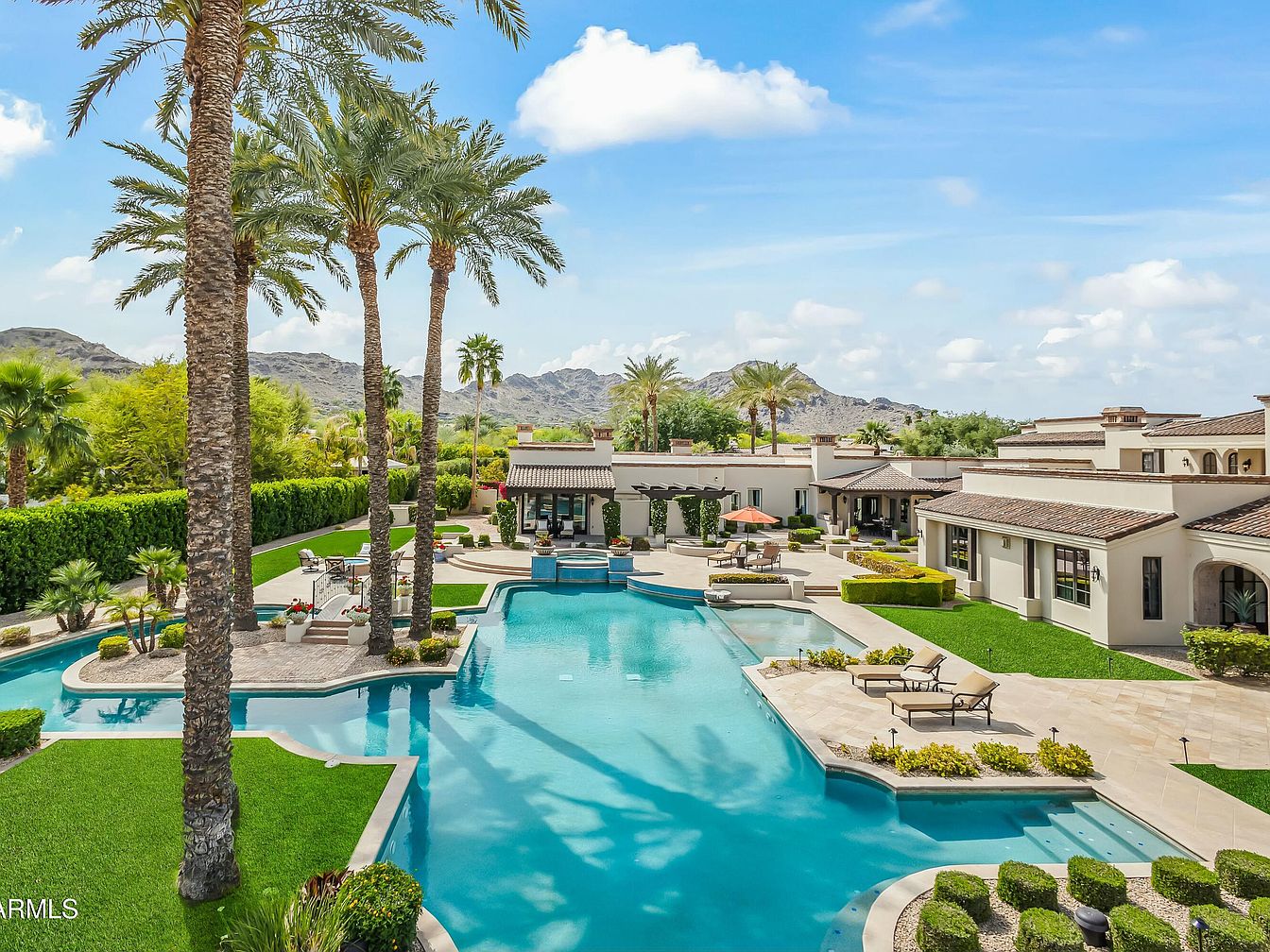 This stunning estate in Paradise Valley, AZ, priced at $17,900,000, exemplifies timeless sophistication with its grand foyer, vaulted ceilings, and arched entryways. Built for success-driven individuals, it boasts an indoor sports court and private theater, ideal for both relaxation and entertainment. The Mediterranean-inspired architectural style and prime location near premier resorts and dining enhance its appeal. With generous outdoor space featuring a resort-style pool and breathtaking mountain views, this home seamlessly marries luxury with livable elegance. The primary suite offers a personal retreat, complete with dual baths and a private courtyard, while the recently renovated guest house provides unparalleled privacy, making it the epitome of modern, success-oriented living.