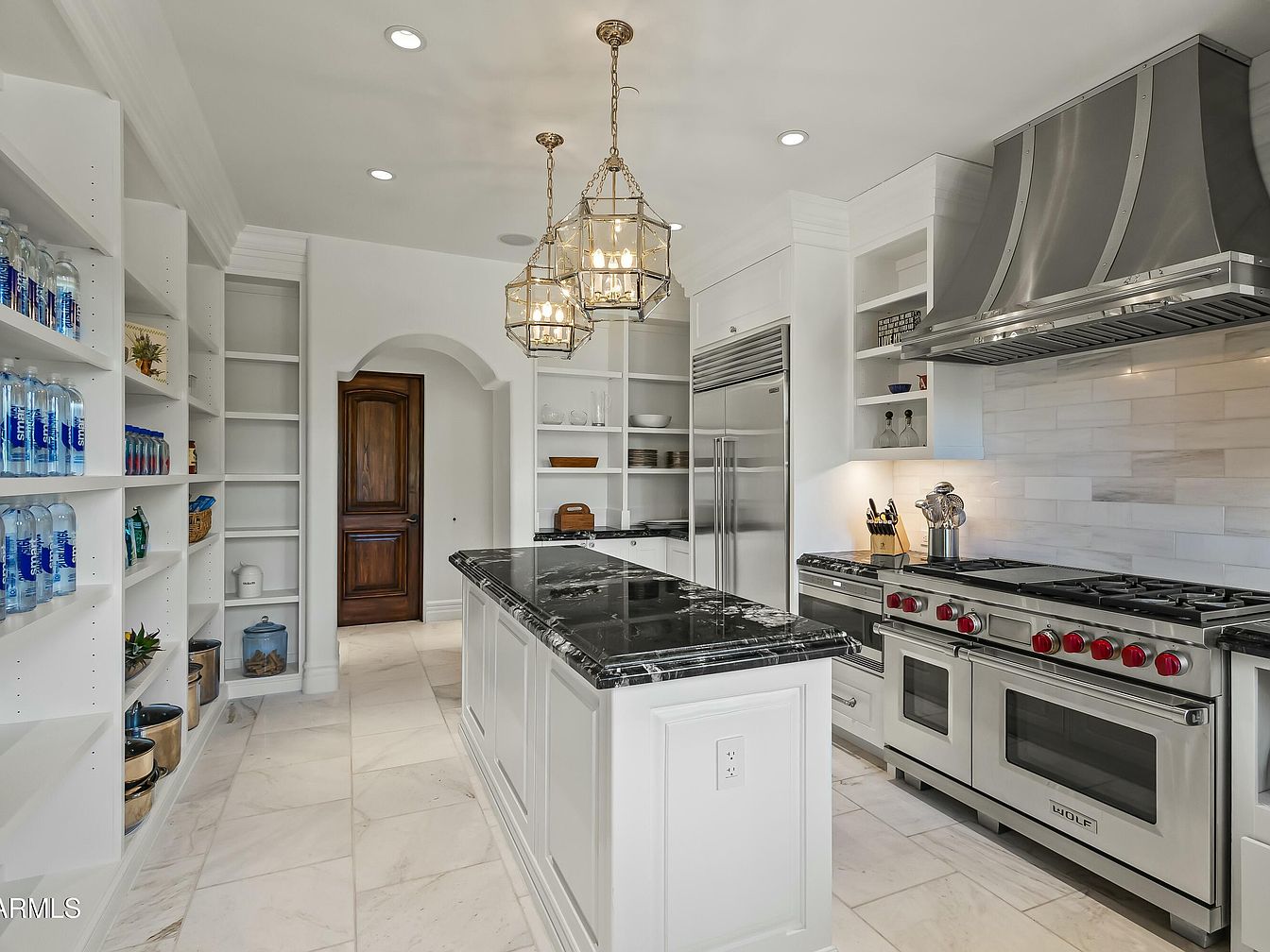 This modern kitchen blends functionality with style, featuring an expansive layout that encourages family gatherings. A stunning black granite island serves as the centerpiece, accompanied by sleek white cabinetry that offers ample storage. The open shelving displays beautiful glassware, enhancing organization and accessibility. Elegant pendant lights illuminate the space, while a stainless-steel hood above the chef’s range showcases a commitment to high-quality appliances. A convenient pantry tucked away with a graceful arch gives easy access for storing essentials. The light marble flooring completes the inviting atmosphere, making it perfect for cooking and entertaining.