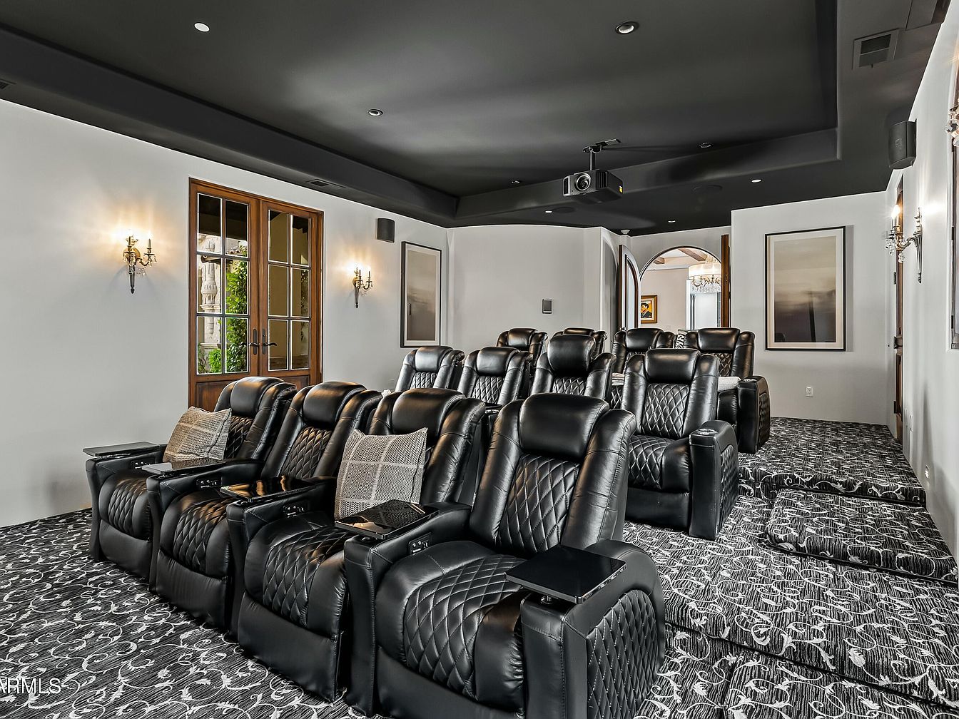 This sophisticated home theater features luxurious leather recliner seating, offering comfort and style for movie nights. Richly textured black carpeting enhances the ambiance while providing a cozy atmosphere. Elegant sconces provide subtle lighting, harmonizing with the deep black ceiling that creates an immersive cinematic experience. Large double doors, framed with classic detailing, invite access to the room while allowing natural light to filter through, preserving the space’s intimate feel. Neutral walls accented with contemporary artwork accentuate the modern aesthetics, making it an ideal recreational sanctuary for the whole family.