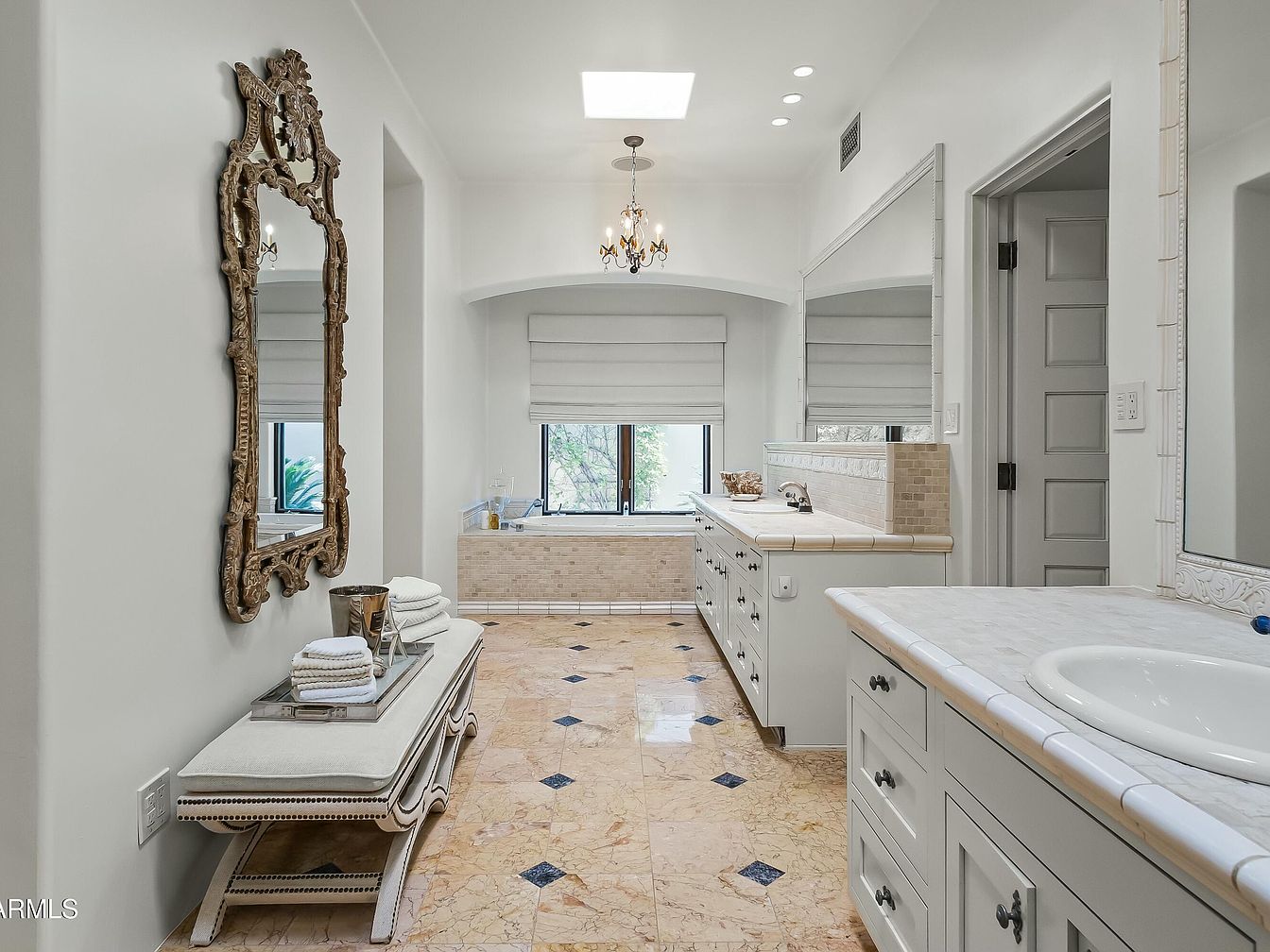 This luxurious bathroom combines modern elegance with functionality. Soft neutral tones dominate the color scheme, creating a soothing atmosphere. The spacious design features dual vanity counters accented with intricate tiling, providing ample storage and surface space. A classic ornate mirror adds a touch of sophistication, reflecting natural light from the window. The flooring, adorned with dark accents, contrasts beautifully against the light cabinetry, enhancing the space’s warmth. Plush towels neatly arranged on a stylish bench invite comfort, while the chic chandelier overhead adds a hint of glamour, making this bathroom a tranquil retreat perfect for relaxation.