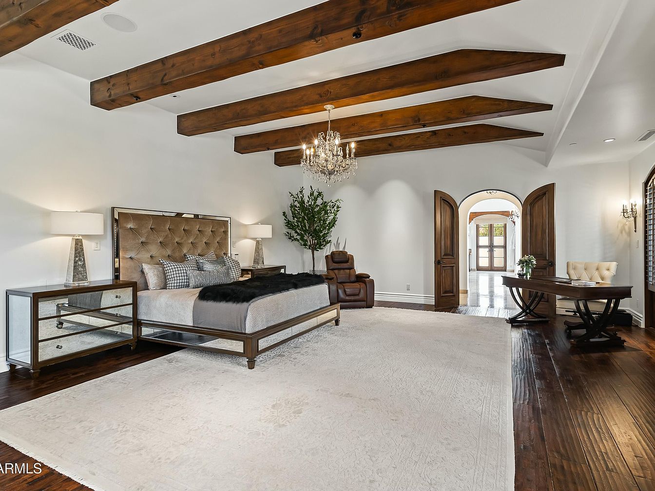 This spacious master bedroom combines luxury and comfort with its striking design. Exposed wooden beams contrast beautifully against the sleek white walls, amplifying the room’s airy feel. A sumptuous tufted headboard framed in mirrored accents defines the plush king-size bed, perfectly complemented by chic bedside lamps. A cozy seating area invites relaxation, while the elegant chandelier adds a touch of grandeur. Rich hardwood floors enhance the warmth, and a soft area rug provides a welcoming atmosphere. Architectural arches lead to the entry, showcasing thoughtful design and inviting natural light, creating an ideal retreat for any homeowner.