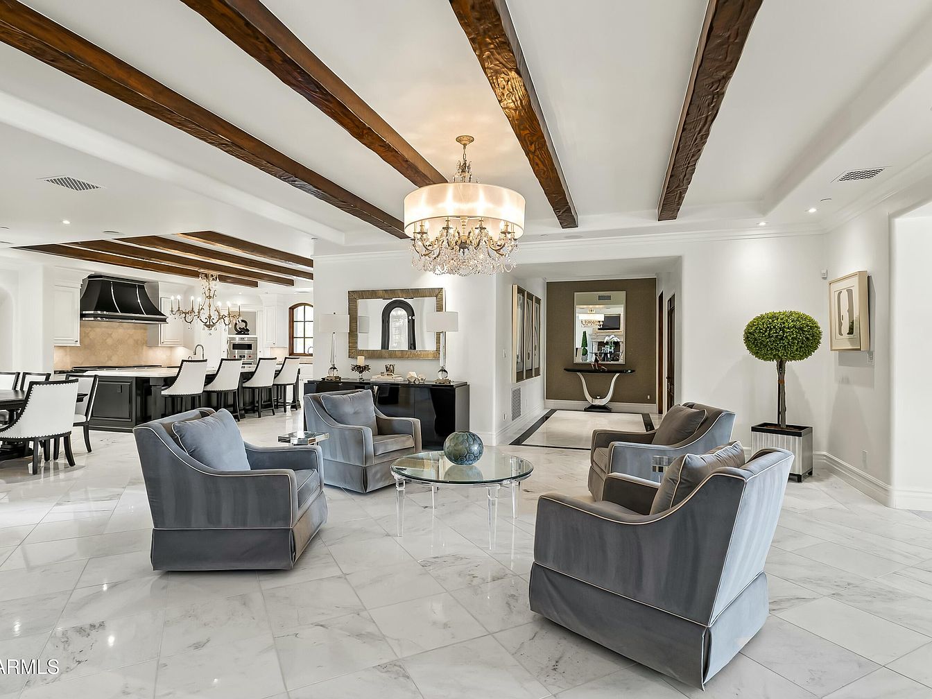 This spacious open living area features a harmonious blend of elegance and comfort. The layout seamlessly integrates a modern kitchen and dining space with stylish seating. Rich wooden beams contrast against the bright white ceiling, enhancing the airy feel. Plush, gray upholstered armchairs invite relaxation, while a chic glass coffee table adds sophistication. The marble flooring reflects natural light, lending a sense of warmth. Decorative elements such as a striking chandelier and contemporary artwork elevate the space, creating a family-friendly atmosphere perfect for social gatherings. Stylish potted greenery offers a touch of vitality and balance to the room.