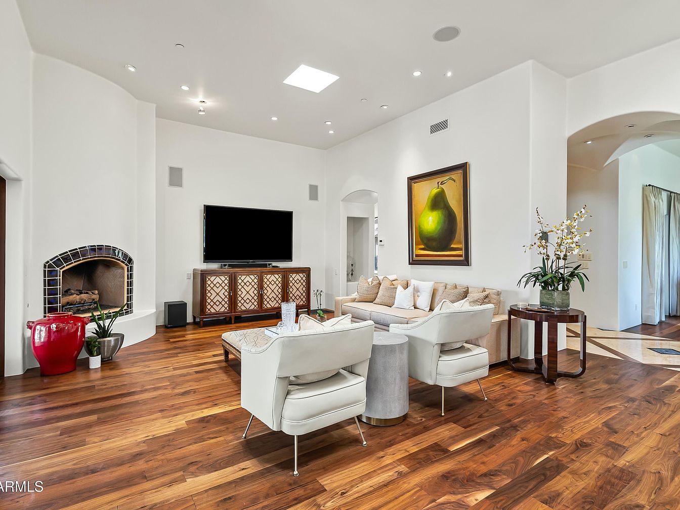 This inviting living room features a modern yet cozy layout, demonstrating balance between style and comfort. A sleek fireplace, adorned with elegant tiles, serves as a focal point, enhancing the warm ambiance created by rich, polished wooden floors. The color palette is a soothing mix of whites and creams, complemented by soft beige furniture adorned with plush pillows. A statement piece of art adds a touch of sophistication, while strategically placed plants and decorative elements contribute to the family-friendly vibe. Ample natural light filters through the space, making it a perfect gathering spot for relaxation and entertainment.