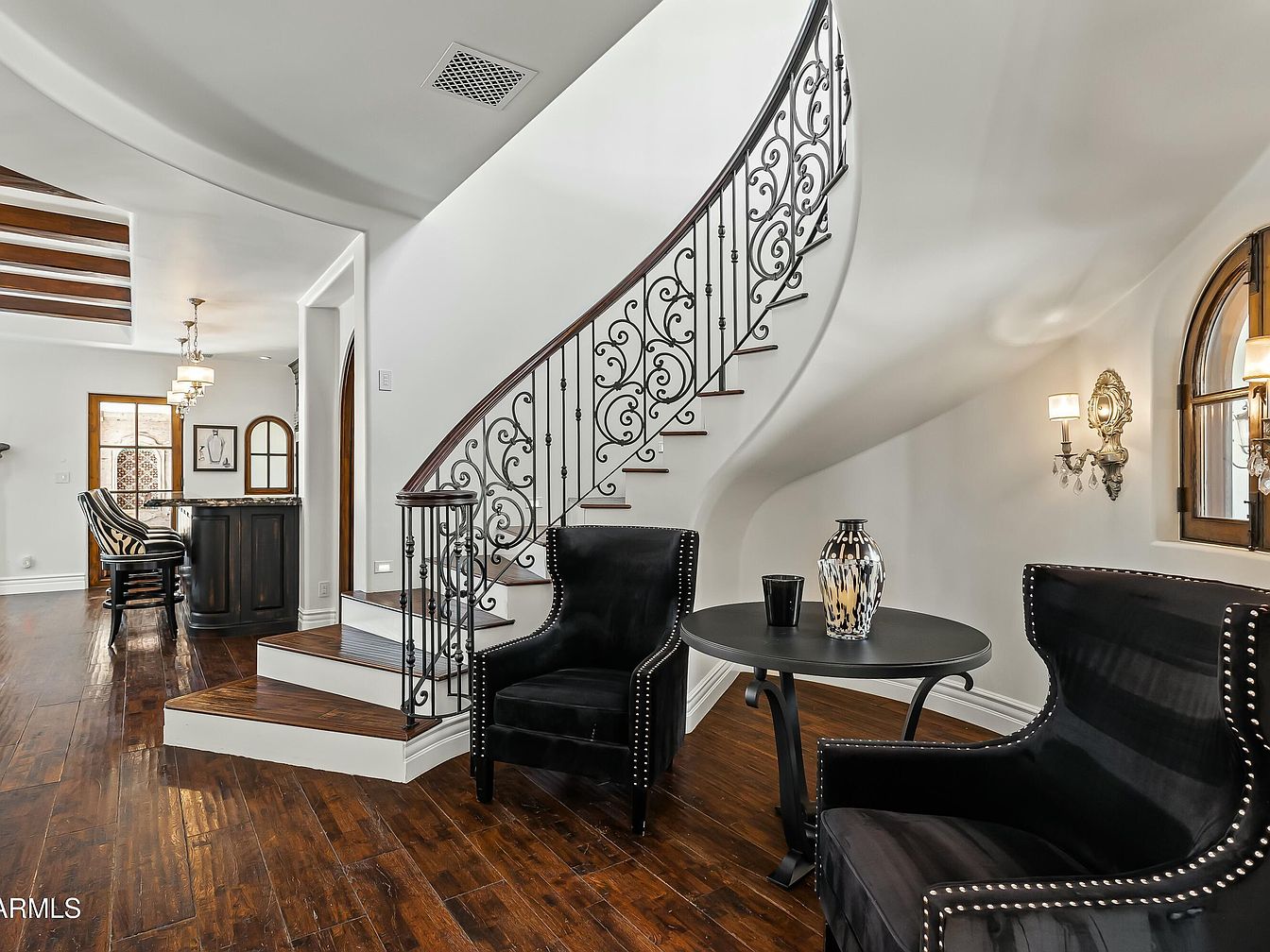 This elegant entryway exudes a blend of modern comfort and classic charm. A sweeping staircase, adorned with intricate wrought-iron railings, draws the eye upwards, while hardwood flooring adds warmth and richness to the space. Dark velvet armchairs invite relaxation beside a sleek round table, ideal for family gatherings. The light color palette of the walls enhances the natural light pouring in through the arched windows, showcasing timeless architectural details. Elegant sconces flank the walls, providing soft lighting, making this area not just a passage but a welcoming introduction to the home, perfect for entertaining and family life.