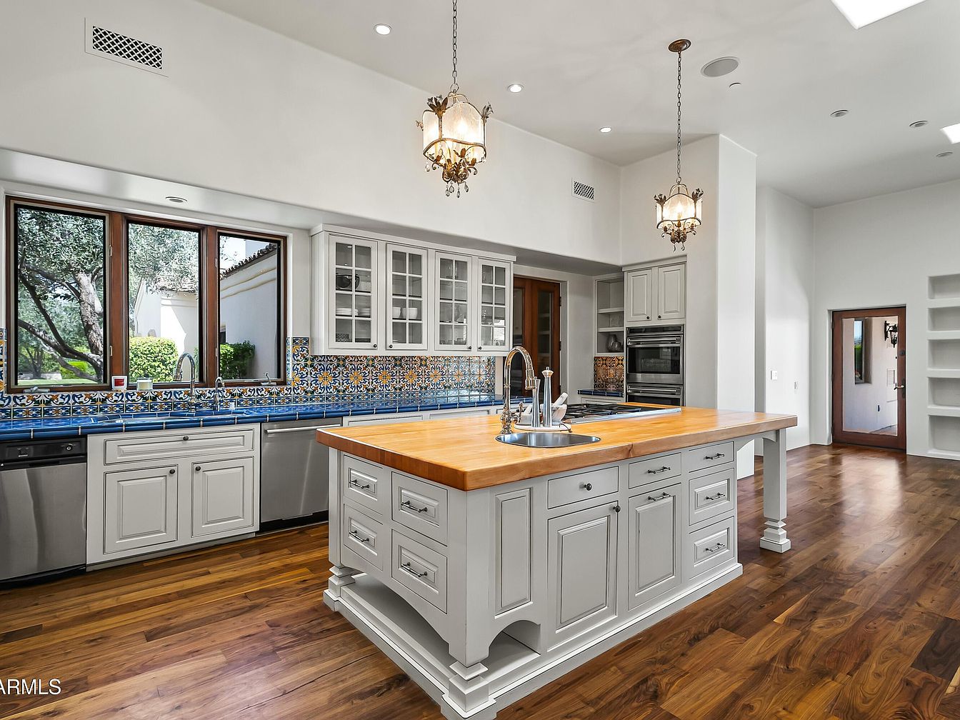 This spacious kitchen showcases a central island crafted from warm, natural wood, offering a perfect gathering spot for family and friends. Complemented by elegant gray cabinetry and modern stainless-steel appliances, the design seamlessly blends functionality with style. Stunning blue and yellow patterned tiles adorn the backsplash, adding a vibrant Mediterranean touch that enhances the airy atmosphere created by large windows. A dual-basin sink overlooks a lush outdoor area, inviting natural light. Elegant pendant lights hang gracefully from the ceiling, while the rich wooden flooring warms up the space, making it both inviting and aesthetically pleasing.