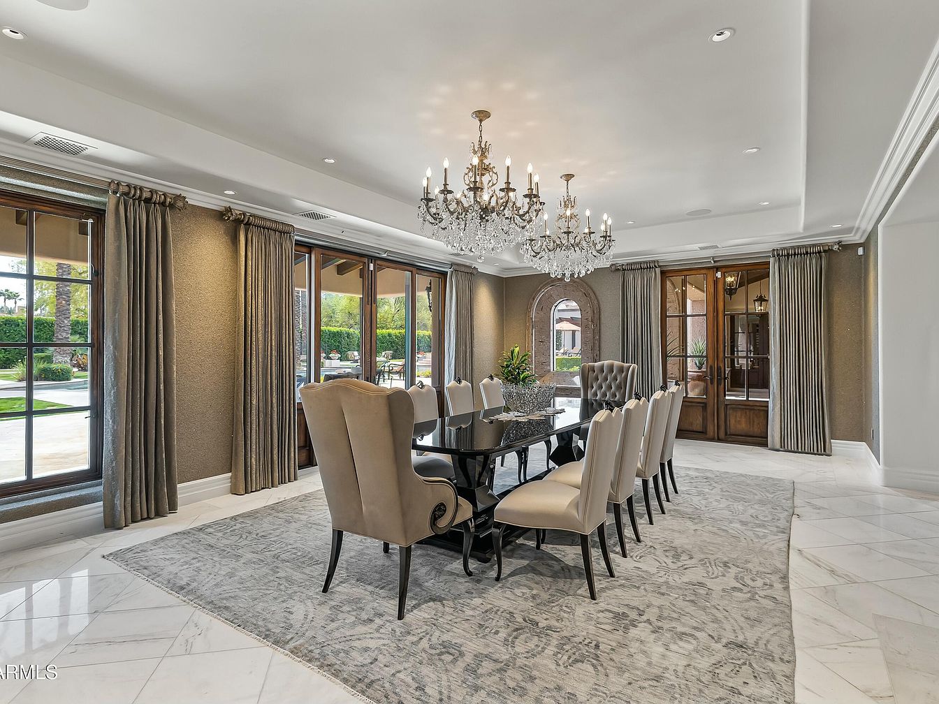 This sophisticated dining room blends luxury and warmth, showcasing a grand table surrounded by plush, high-backed chairs in soft beige tones. The elegant chandelier casts a soft glow, enhancing the ornate details of the space. Rich, textured wallpaper complements the dark wood accents, while large windows draped in subtle curtains invite natural light, revealing picturesque views of the landscaped yard. The polished marble flooring adds a touch of refinement, while a cozy area rug ties the seating together, creating an inviting atmosphere perfect for family gatherings and entertaining. Architectural details reflect thoughtful design and classic charm.