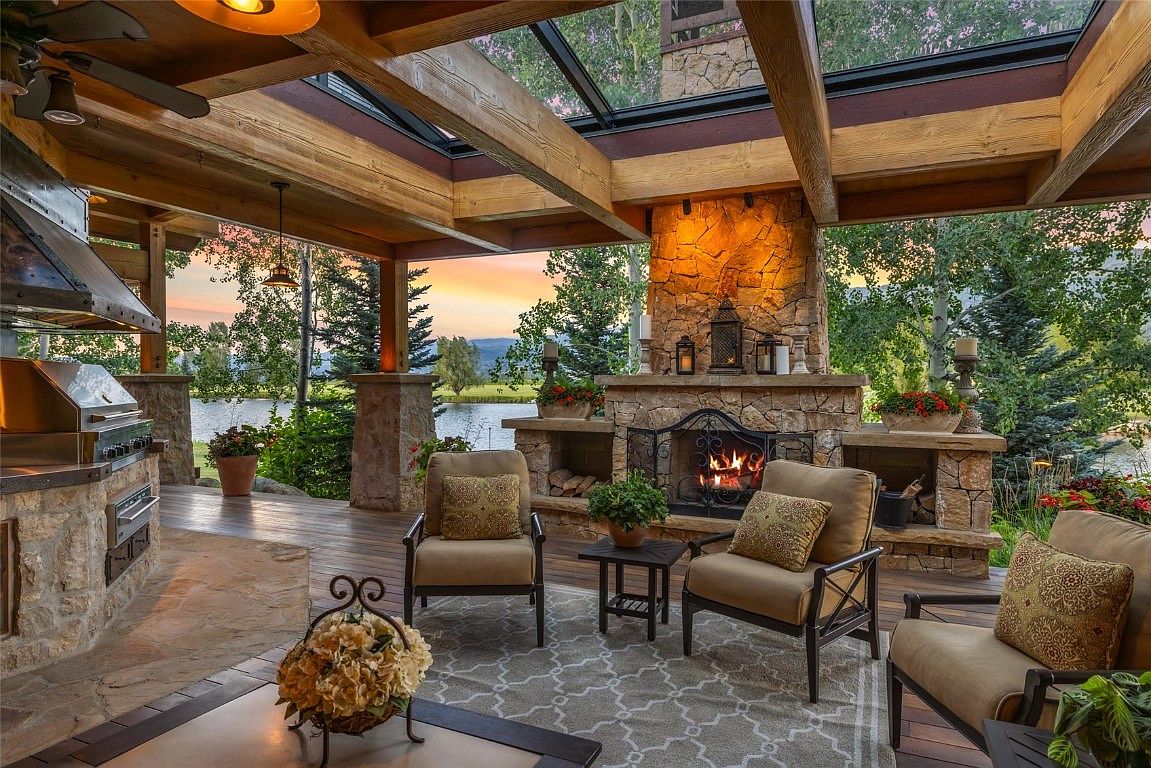 This stunning outdoor living space showcases a seamless blend of comfort and elegance, ideal for family gatherings or quiet evenings. The inviting seating area features plush, cushioned chairs adorned with decorative pillows, arranged around a stylish coffee table. A grand stone fireplace serves as a centerpiece, providing warmth and ambiance, while the adjacent outdoor kitchen boasts a sleek grill, perfect for summer barbecues. The open ceiling, framed by exposed wooden beams, enhances the airy feel, allowing natural light to flow in. Surrounded by lush greenery and a serene view of water, this space epitomizes relaxation and togetherness.