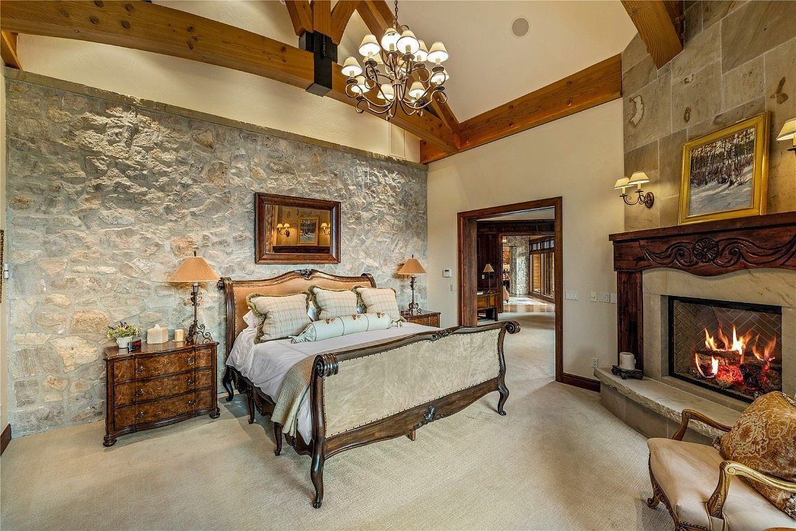 This master bedroom showcases a harmonious blend of rustic charm and modern elegance. The striking stone wall features a cozy fireplace, providing warmth and a focal point for relaxation. Rich wooden beams stretch across the vaulted ceiling, enhancing the room’s spaciousness. A sumptuous king-size bed, adorned with plush pillows and elegant bedding, invites restful nights. A vintage bedside table complements the décor, while soft lighting from wall sconces adds a soothing ambiance. Neutral tones throughout create a serene atmosphere, making this space a perfect family-friendly retreat for comfort and style.