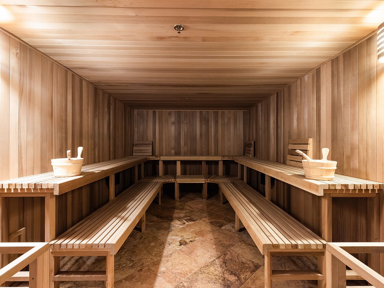 Warm wood paneling envelops this spacious home sauna, creating a tranquil and luxurious environment perfect for relaxing with family and friends. Two tiers of wide benches line the walls on both sides, offering ample seating for multiple people and making it easy to socialize or enjoy quiet time. The natural light wood finish emphasizes cleanliness and warmth, while soft lighting from above adds to the soothing ambiance. Neutral stone flooring complements the wooden interior, enhancing the calming effect. Essential sauna buckets and traditional ladles are thoughtfully placed, completing a cozy and hygienic relaxation zone ideal for family wellness.