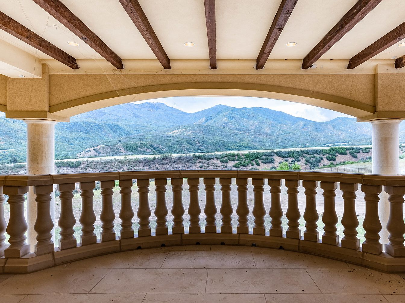 This inviting balcony features classic architectural elements with a curved balustrade and grand columns, opening up to breathtaking panoramic mountain views. The ceiling is adorned with exposed wooden beams that add a rustic touch, contrasting elegantly against the soft beige plaster. Large arched openings bring abundant natural light while sheltered space ensures comfort year-round, making it ideal for family gatherings or peaceful solo moments. The warm neutral tones of stone flooring and railings create a serene, sophisticated ambiance, providing the perfect setting for enjoying the outdoors, entertaining guests, or simply relaxing with a morning coffee while children safely play nearby.