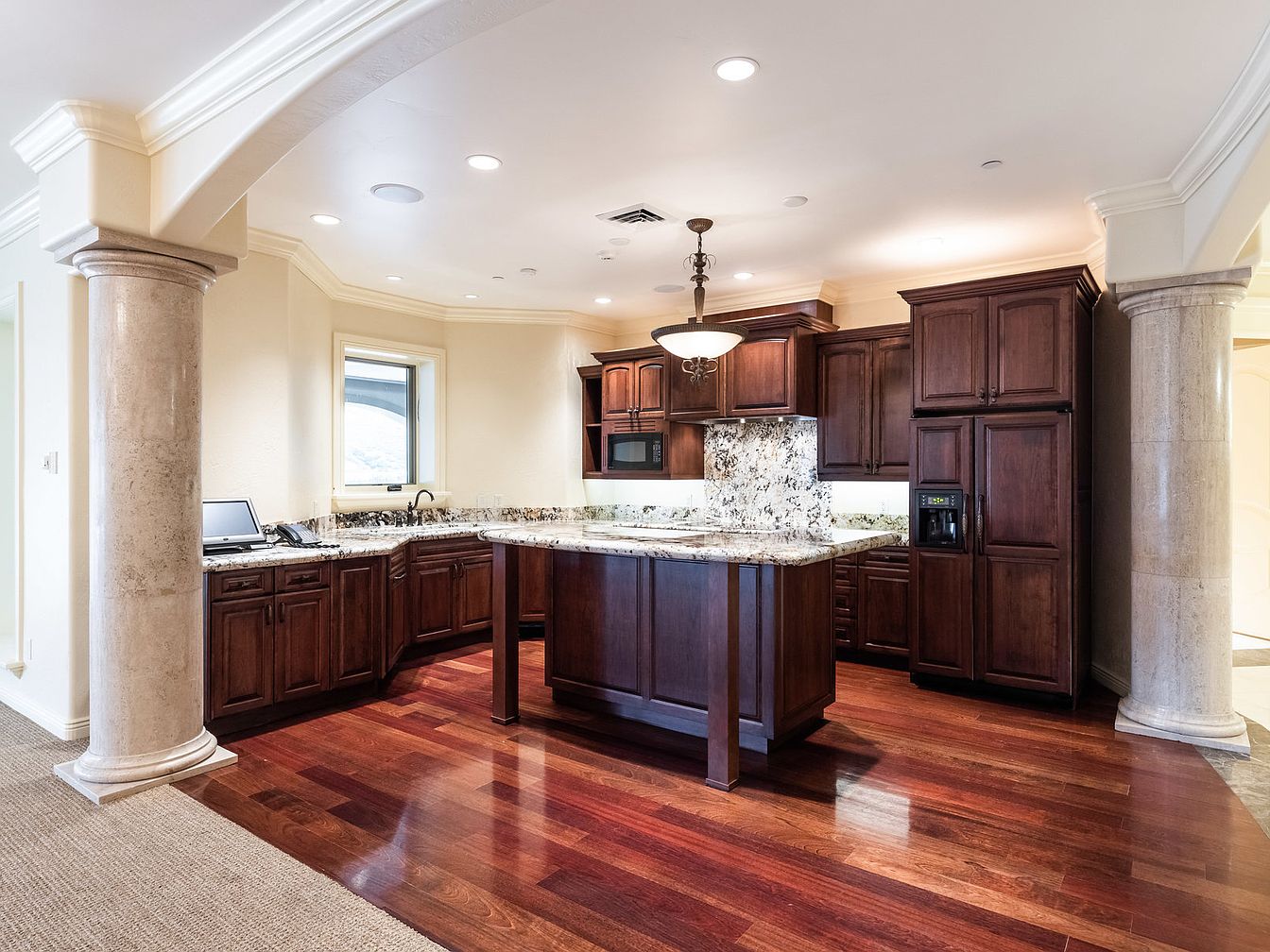 An elegant, spacious kitchen featuring rich cherry wood cabinetry and a large central island topped with luxurious granite. The countertops and matching backsplash highlight a sophisticated natural stone pattern, enhancing both durability and visual appeal. Warm-toned hardwood flooring pairs perfectly with the cabinetry, while creamy walls and crown molding add brightness to the space. Grand columns and an arched ceiling transition create an open, welcoming atmosphere ideal for gatherings. Built-in appliances and generous counter space provide functionality for family cooking, while the window by the sink ensures plenty of natural light. The layout makes this kitchen the heart of family activity.