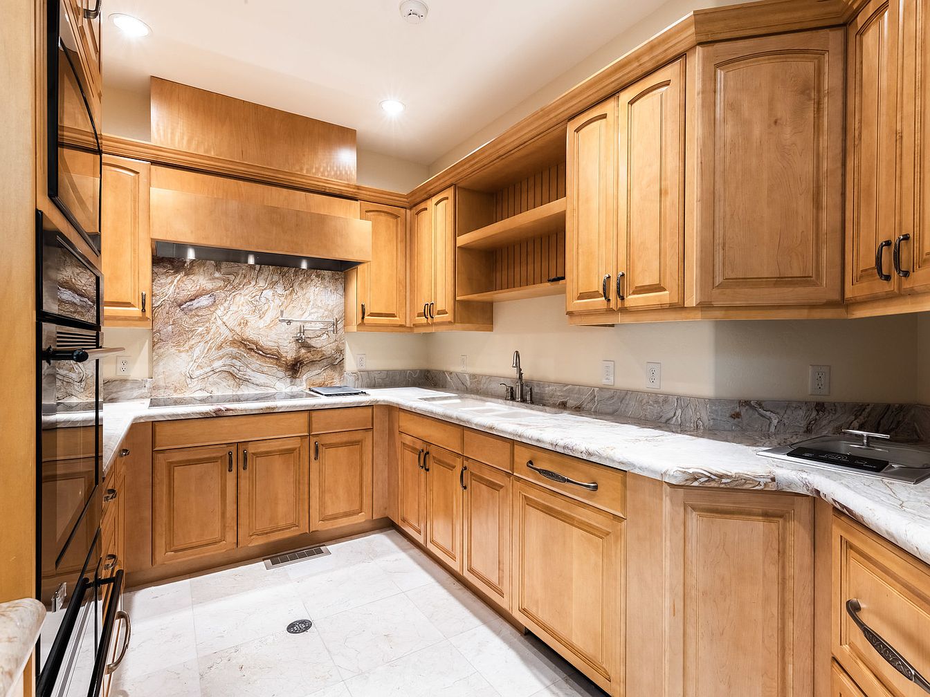Warm, natural wood cabinetry creates an inviting and timeless atmosphere in this spacious kitchen. The layout features a functional U-shaped design, perfect for family cooking and interactive meal prep, with abundant cabinet and drawer storage for all essentials. Striking marble-patterned countertops and backsplash add elegance, while under-cabinet lighting enhances both practicality and ambiance. Open shelving above the countertop allows easy access to everyday items, making it family-friendly and convenient. Neutral walls and light tile flooring keep the space bright and airy, ensuring this kitchen feels welcoming and well-suited for gatherings and daily activities alike.