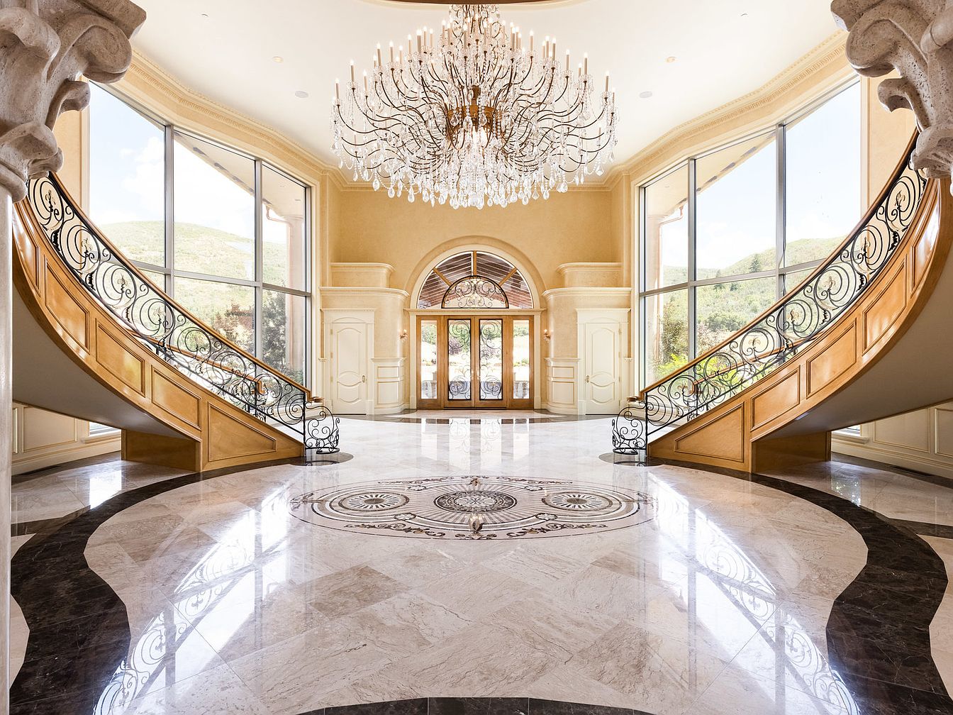An opulent foyer featuring a sweeping double staircase with intricate wrought-iron railings and polished wood accents creates a dramatic entryway. Sunlight pours in through expansive floor-to-ceiling windows, offering scenic views of rolling green hills. The marble floor boasts an elaborate medallion and bold circular patterns, setting a tone of sophistication and elegance. A towering sparkling chandelier anchors the space, making it perfect for entertaining or welcoming guests in style. The open, airy layout accommodates both quiet family gatherings and lively occasions, while the neutral color palette ensures timeless appeal throughout this impressive entryway.